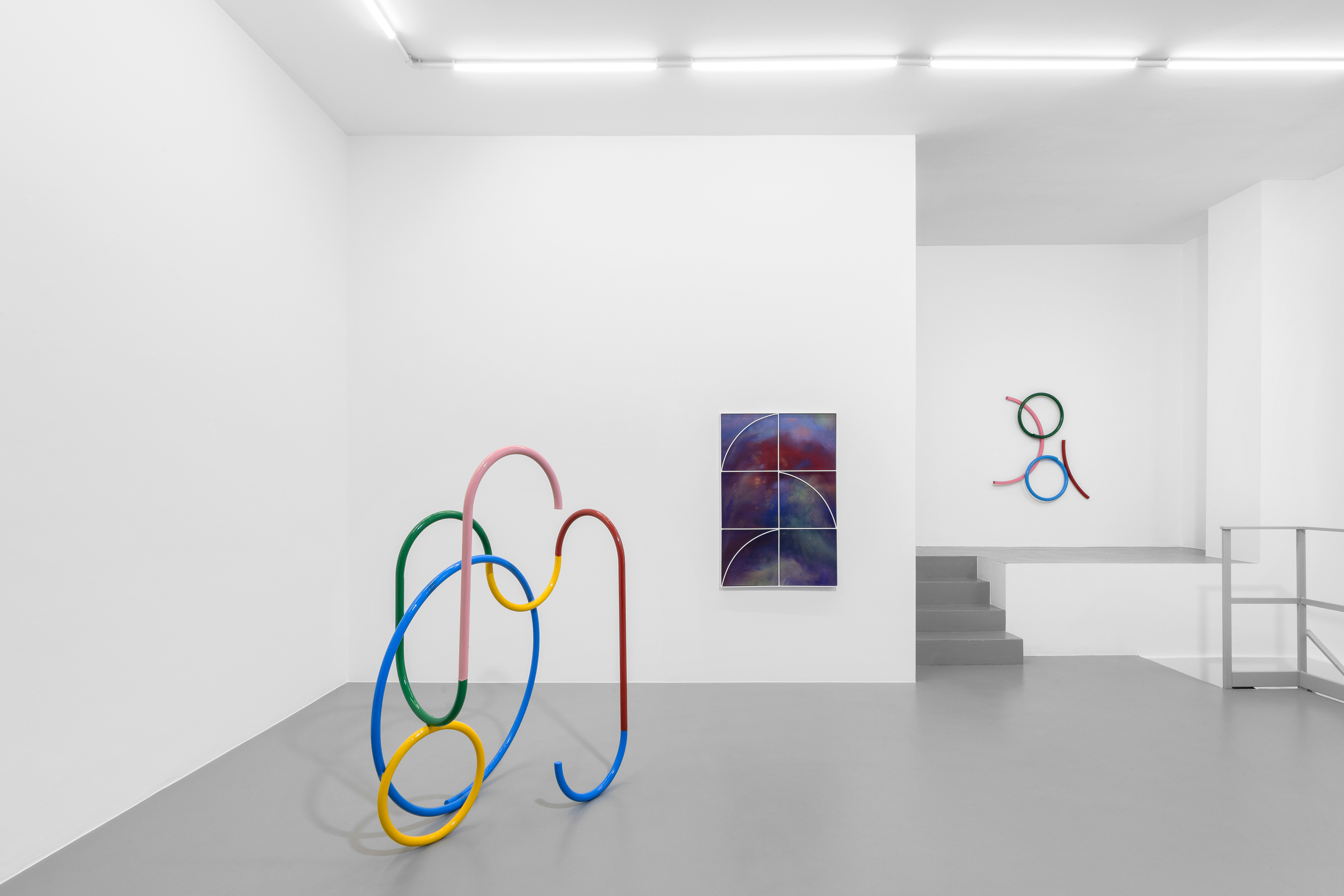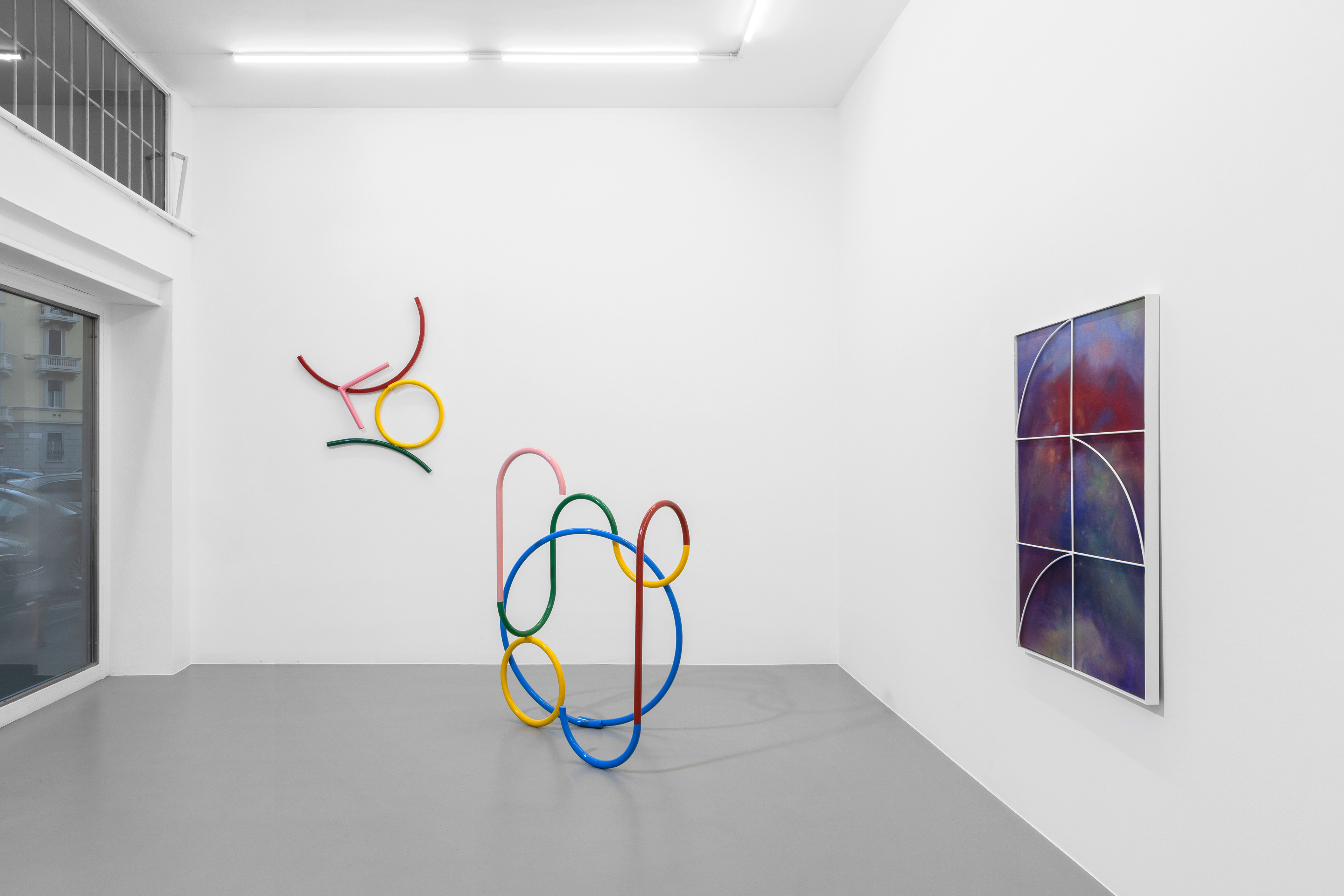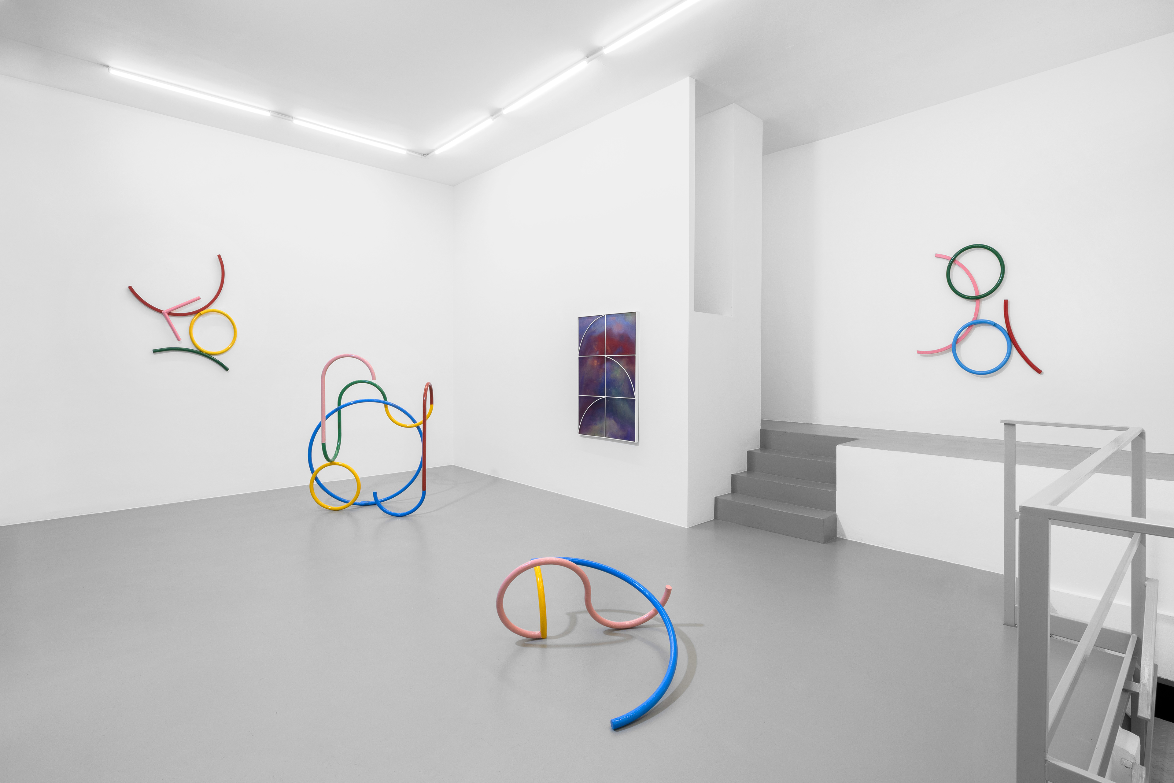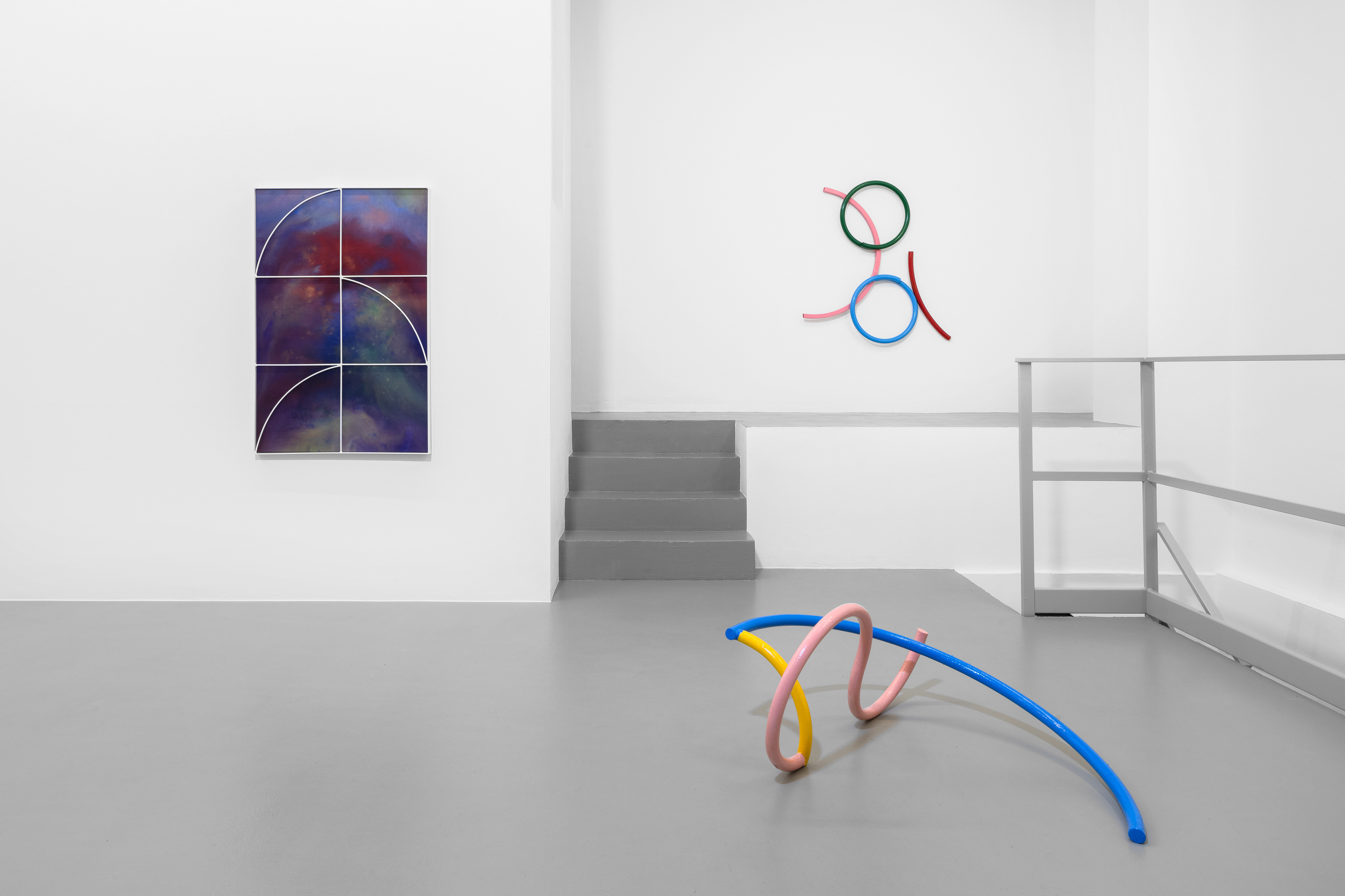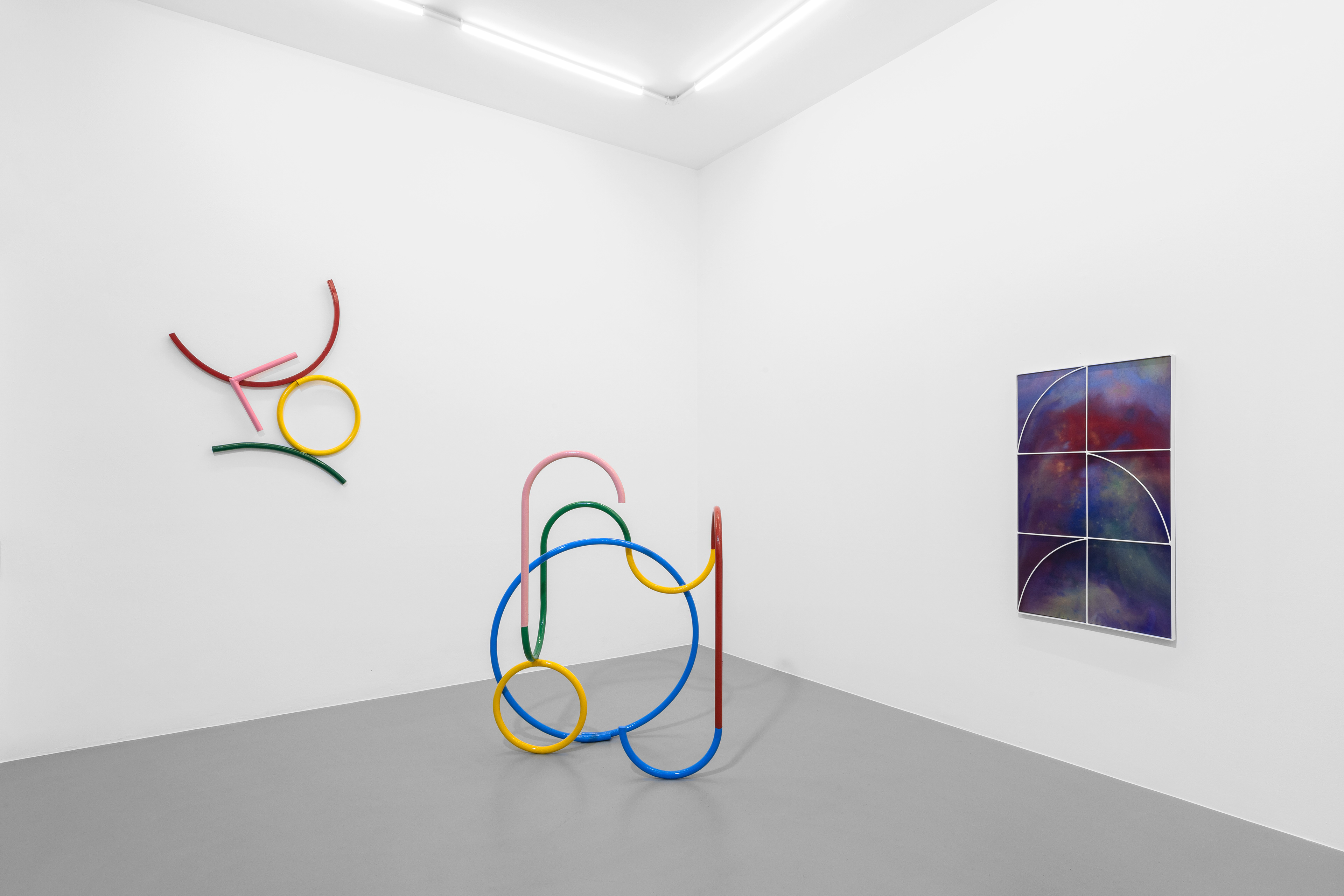 The intent to reconstruct an abstract landscape that retains traces of reality and then opens up to a contemplative dimension is also present in the sculptural works scattered on the gallery floor and walls. The compositions created through the assembly of painted metal tubes hark back to children’s playgrounds that were widespread in the USSR and its satellite states, and an integral part of the urban landscape in the 1970s and 1980s. These playground structures, which still exist today, can be found in almost every public garden in large Eastern European cities - and are generally found outside schools or near churches or high-density streets. As standardized and almost “mass-produced” products for their construction, there was a tendency to follow repetitive patterns and designs that went into articulating swings, rockers, rockets, traffic circles, or bridges. The loss of their original functionality in favor of the adoption of a sculptural form that leads back to a certain constructivism on the one hand and to the modus of minimal sculpture on the other makes them appear as something else. These works are a reminder of a childhood he never lived (the artist was born in Poland but grew up in Canada, returning to his homeland only around the age of twenty) and imagined with each weld, each overlapping layer of colored paint, but they are also a broader reflection regarding the failure of certain social and political structures. Thus, an intrinsic movement returns that leads to a continuous shifting between poles, the individual and the collective, the inside and the outside, the micro and the macrocosm.