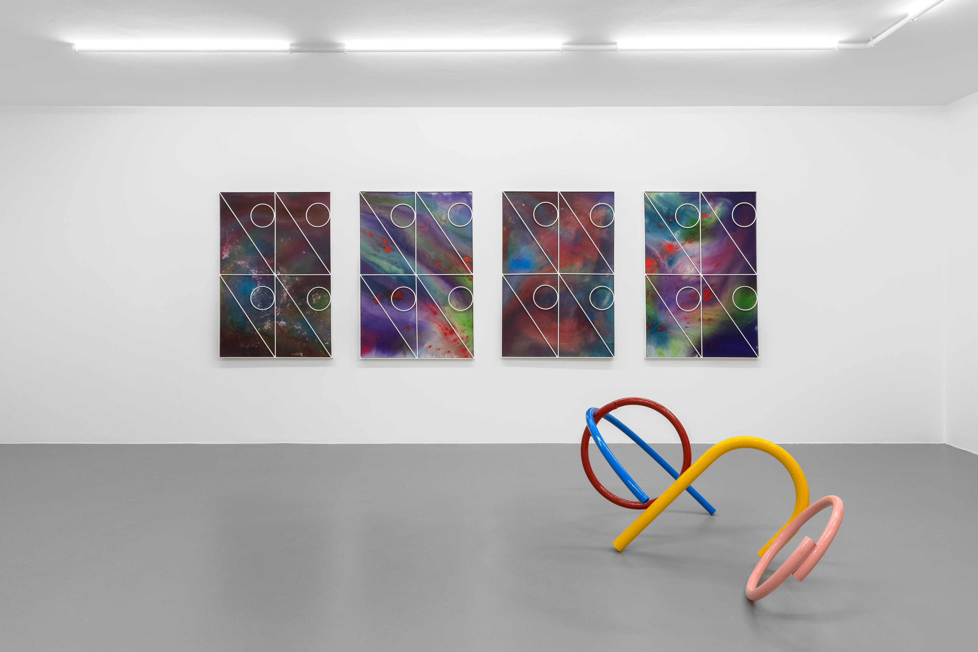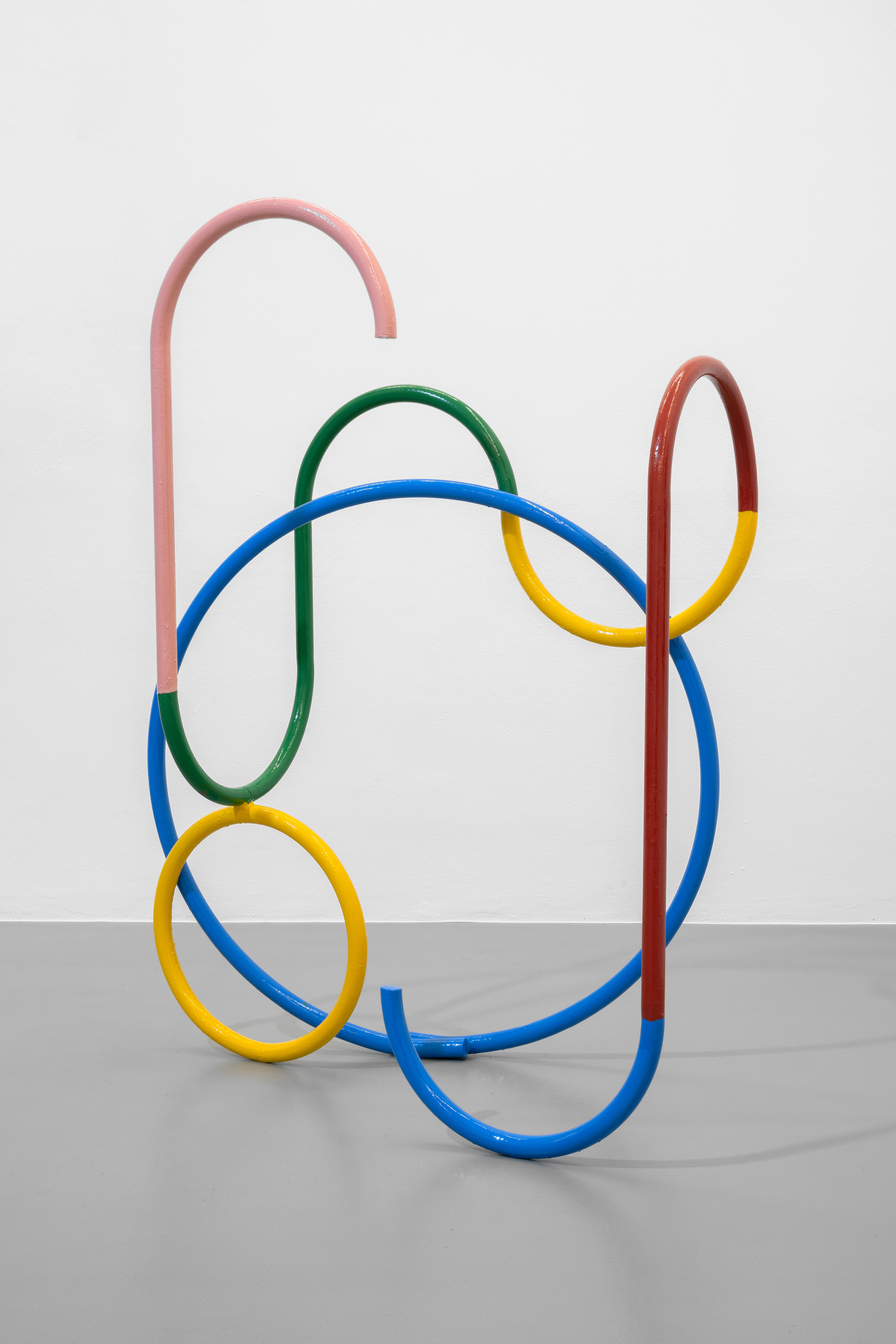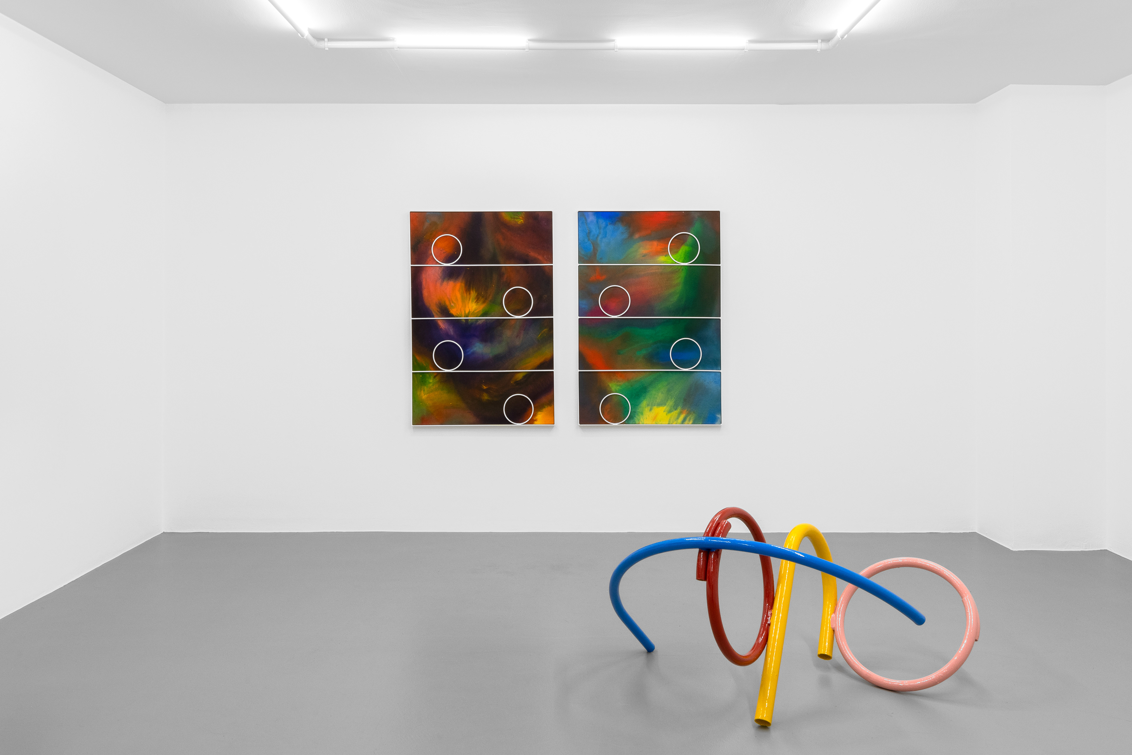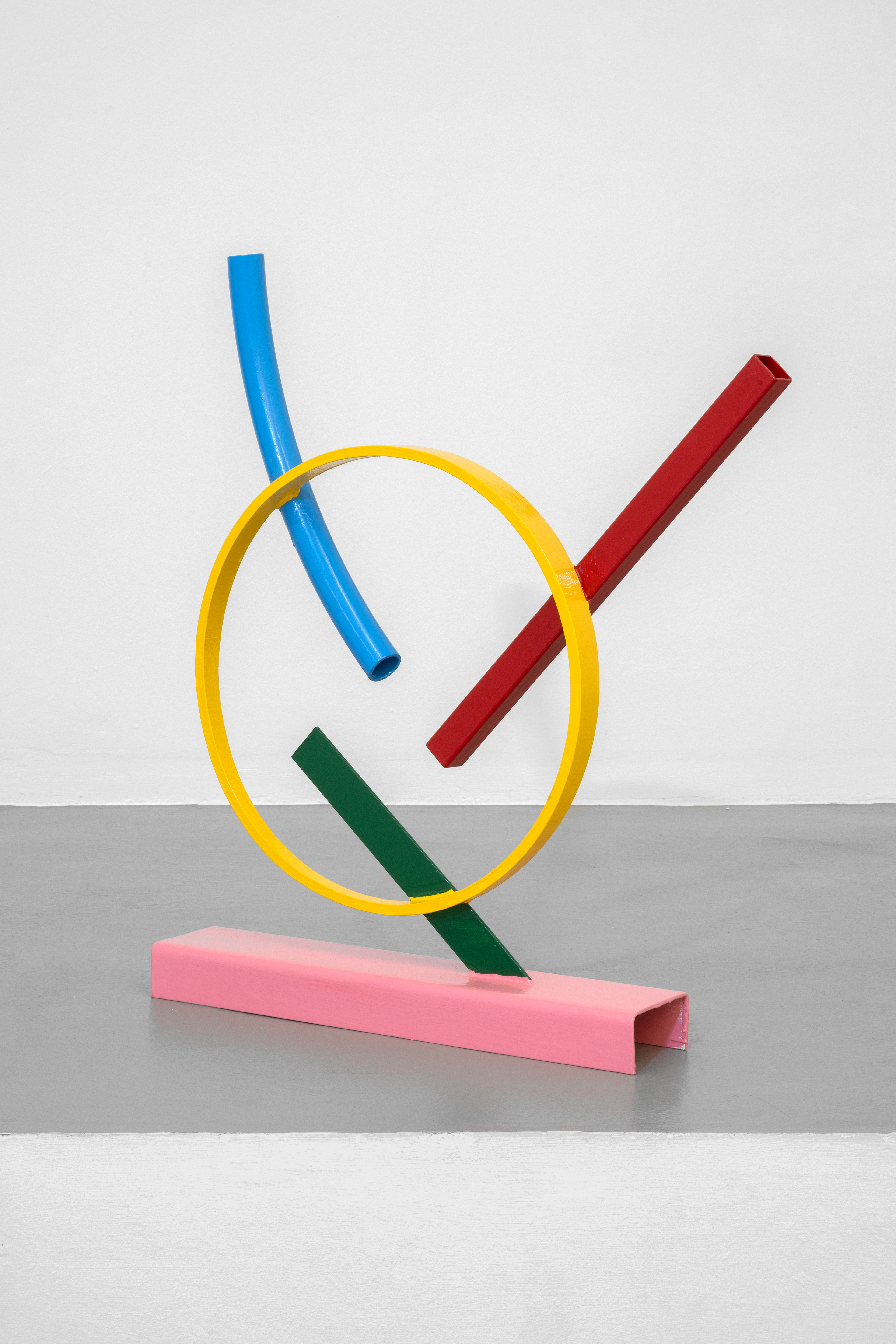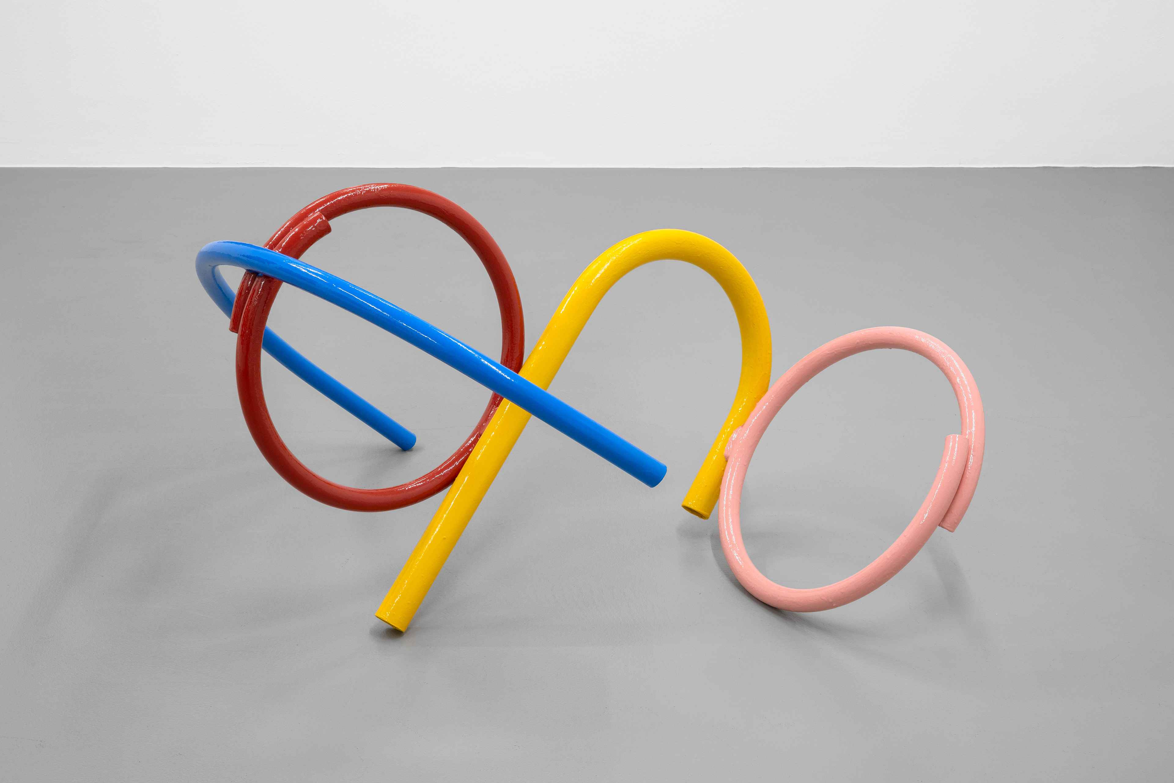 The intent to reconstruct an abstract landscape that retains traces of reality and then opens up to a contemplative dimension is also present in the sculptural works scattered on the gallery floor and walls. The compositions created through the assembly of painted metal tubes hark back to children’s playgrounds that were widespread in the USSR and its satellite states, and an integral part of the urban landscape in the 1970s and 1980s. These playground structures, which still exist today, can be found in almost every public garden in large Eastern European cities - and are generally found outside schools or near churches or high-density streets. As standardized and almost “mass-produced” products for their construction, there was a tendency to follow repetitive patterns and designs that went into articulating swings, rockers, rockets, traffic circles, or bridges. The loss of their original functionality in favor of the adoption of a sculptural form that leads back to a certain constructivism on the one hand and to the modus of minimal sculpture on the other makes them appear as something else. These works are a reminder of a childhood he never lived (the artist was born in Poland but grew up in Canada, returning to his homeland only around the age of twenty) and imagined with each weld, each overlapping layer of colored paint, but they are also a broader reflection regarding the failure of certain social and political structures. Thus, an intrinsic movement returns that leads to a continuous shifting between poles, the individual and the collective, the inside and the outside, the micro and the macrocosm.