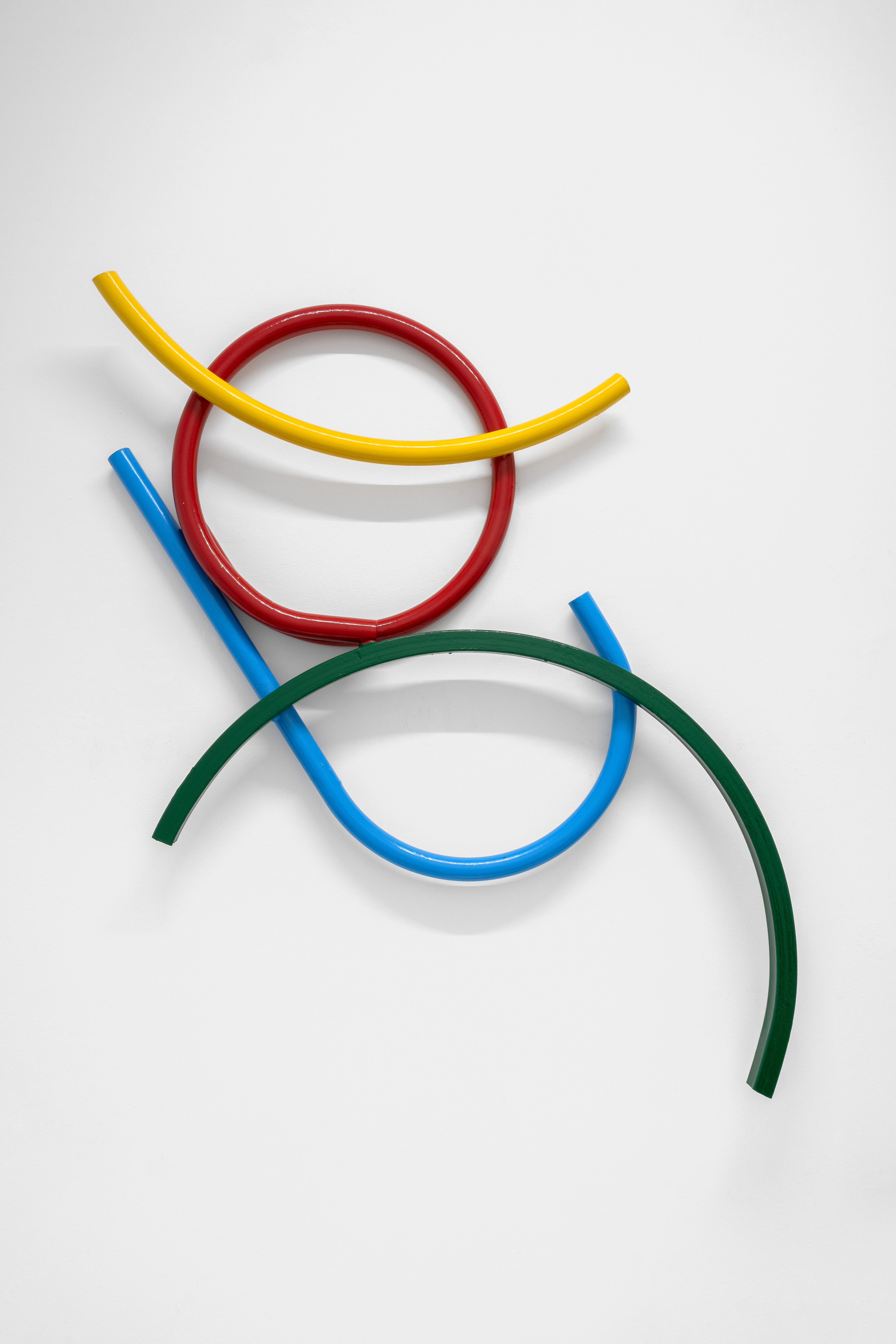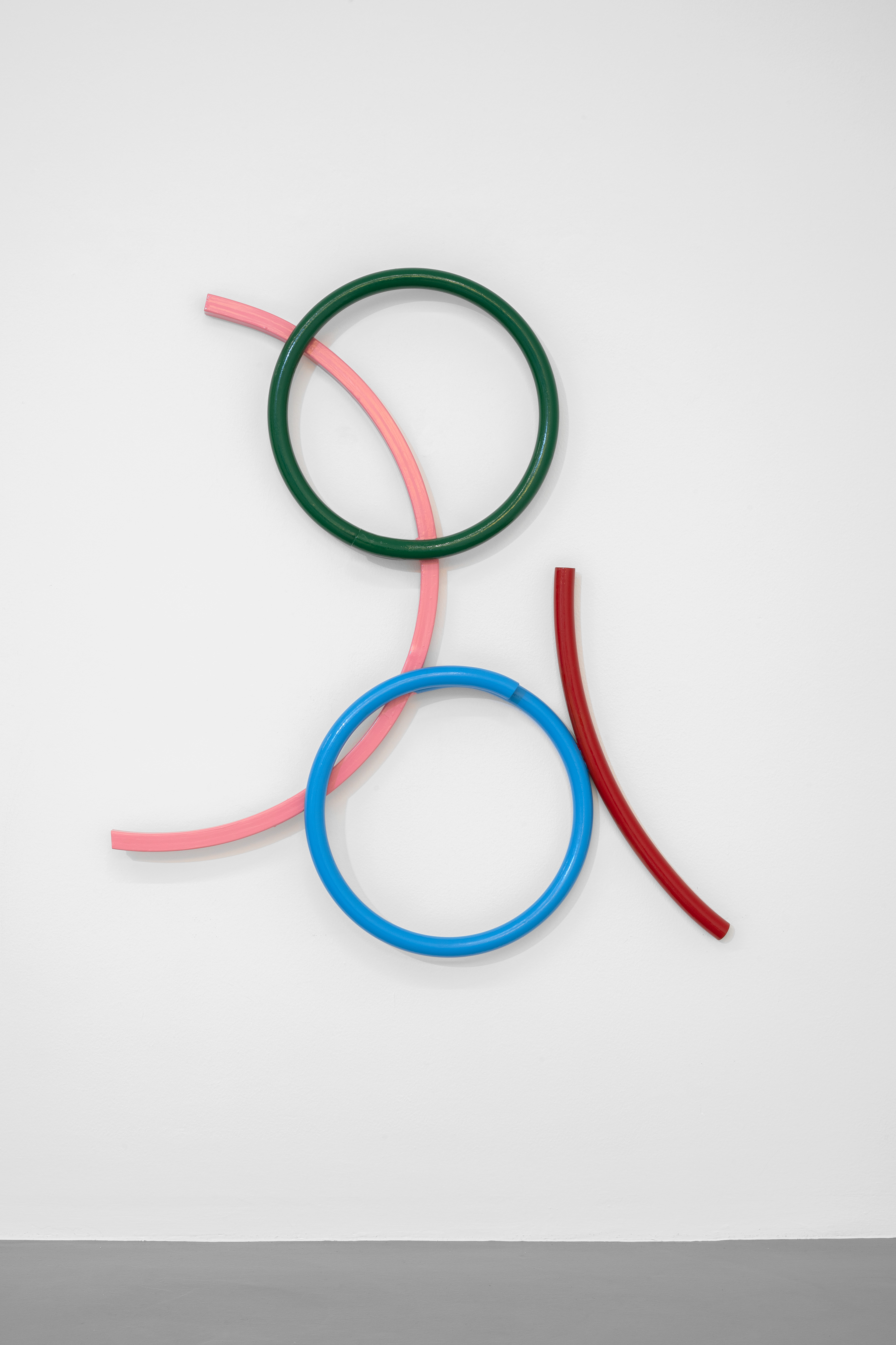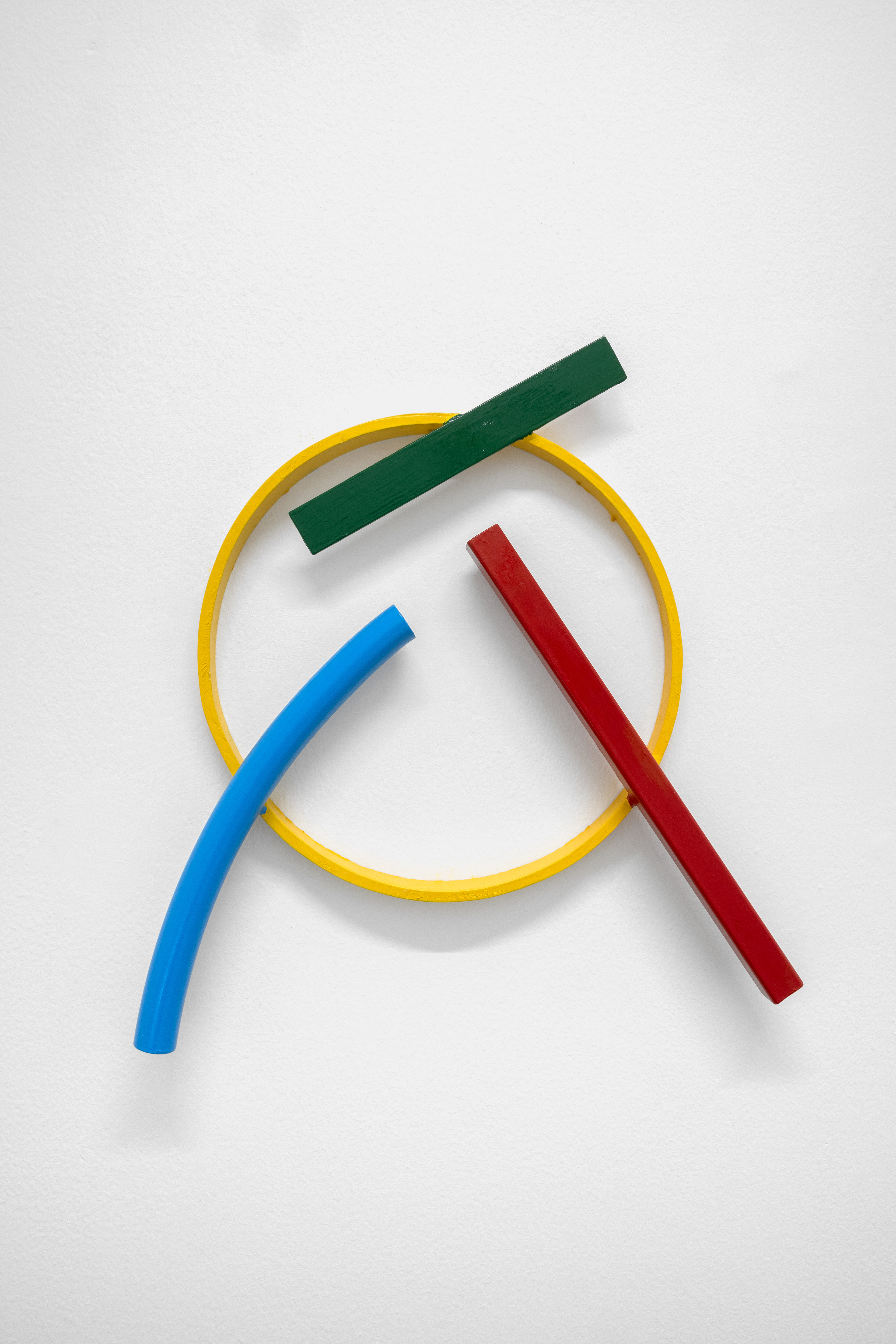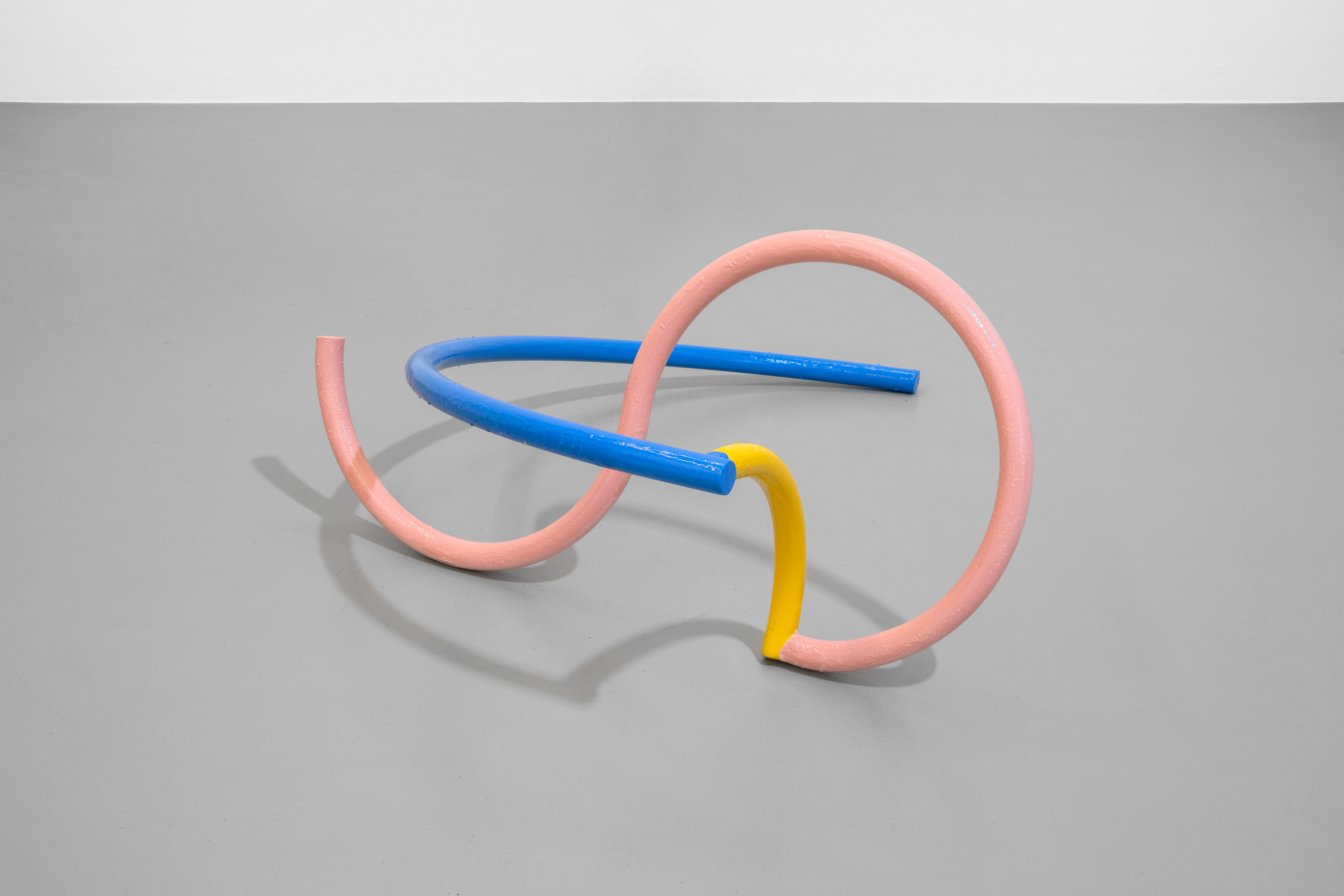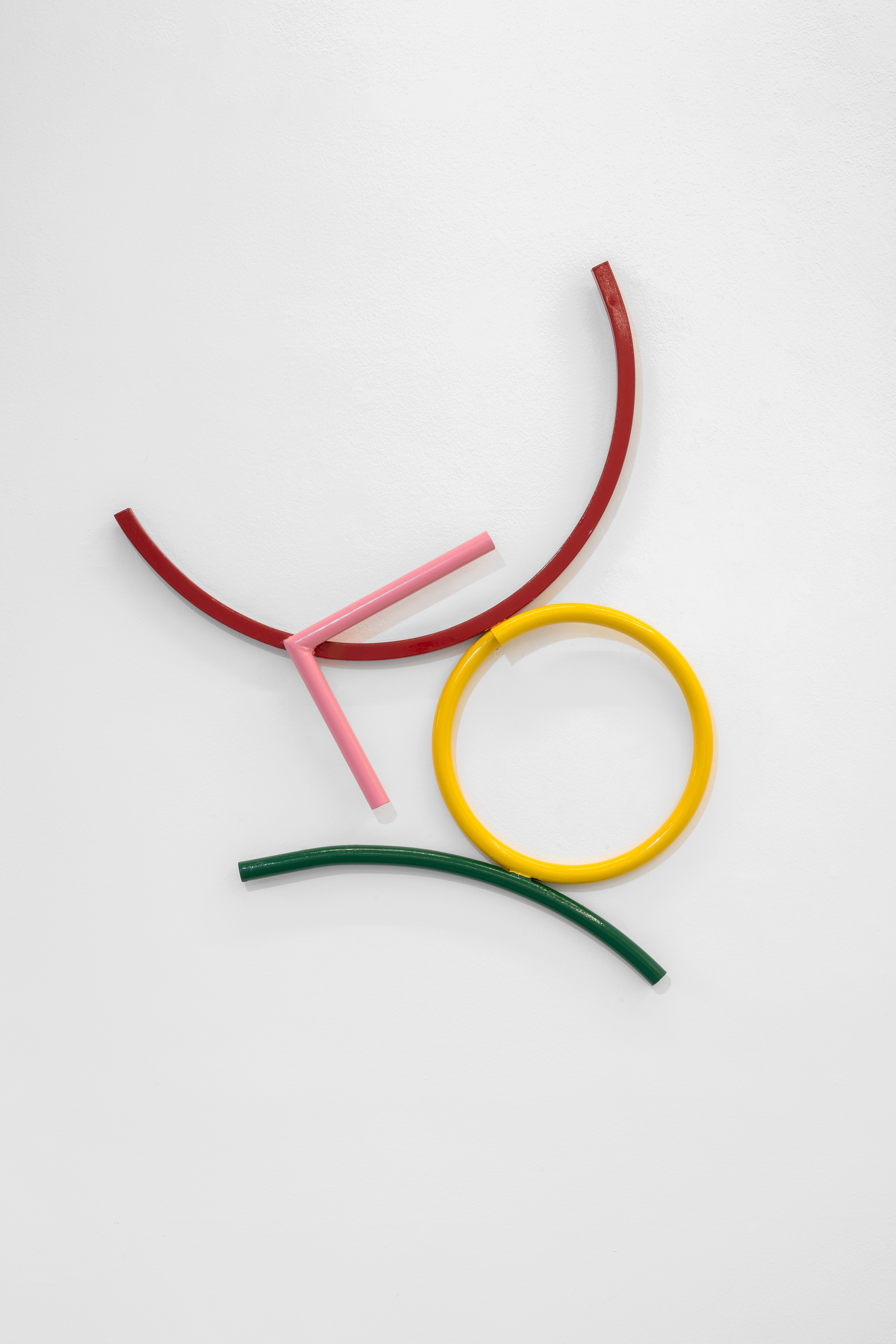 The intent to reconstruct an abstract landscape that retains traces of reality and then opens up to a contemplative dimension is also present in the sculptural works scattered on the gallery floor and walls. The compositions created through the assembly of painted metal tubes hark back to children’s playgrounds that were widespread in the USSR and its satellite states, and an integral part of the urban landscape in the 1970s and 1980s. These playground structures, which still exist today, can be found in almost every public garden in large Eastern European cities - and are generally found outside schools or near churches or high-density streets. As standardized and almost “mass-produced” products for their construction, there was a tendency to follow repetitive patterns and designs that went into articulating swings, rockers, rockets, traffic circles, or bridges. The loss of their original functionality in favor of the adoption of a sculptural form that leads back to a certain constructivism on the one hand and to the modus of minimal sculpture on the other makes them appear as something else. These works are a reminder of a childhood he never lived (the artist was born in Poland but grew up in Canada, returning to his homeland only around the age of twenty) and imagined with each weld, each overlapping layer of colored paint, but they are also a broader reflection regarding the failure of certain social and political structures. Thus, an intrinsic movement returns that leads to a continuous shifting between poles, the individual and the collective, the inside and the outside, the micro and the macrocosm.