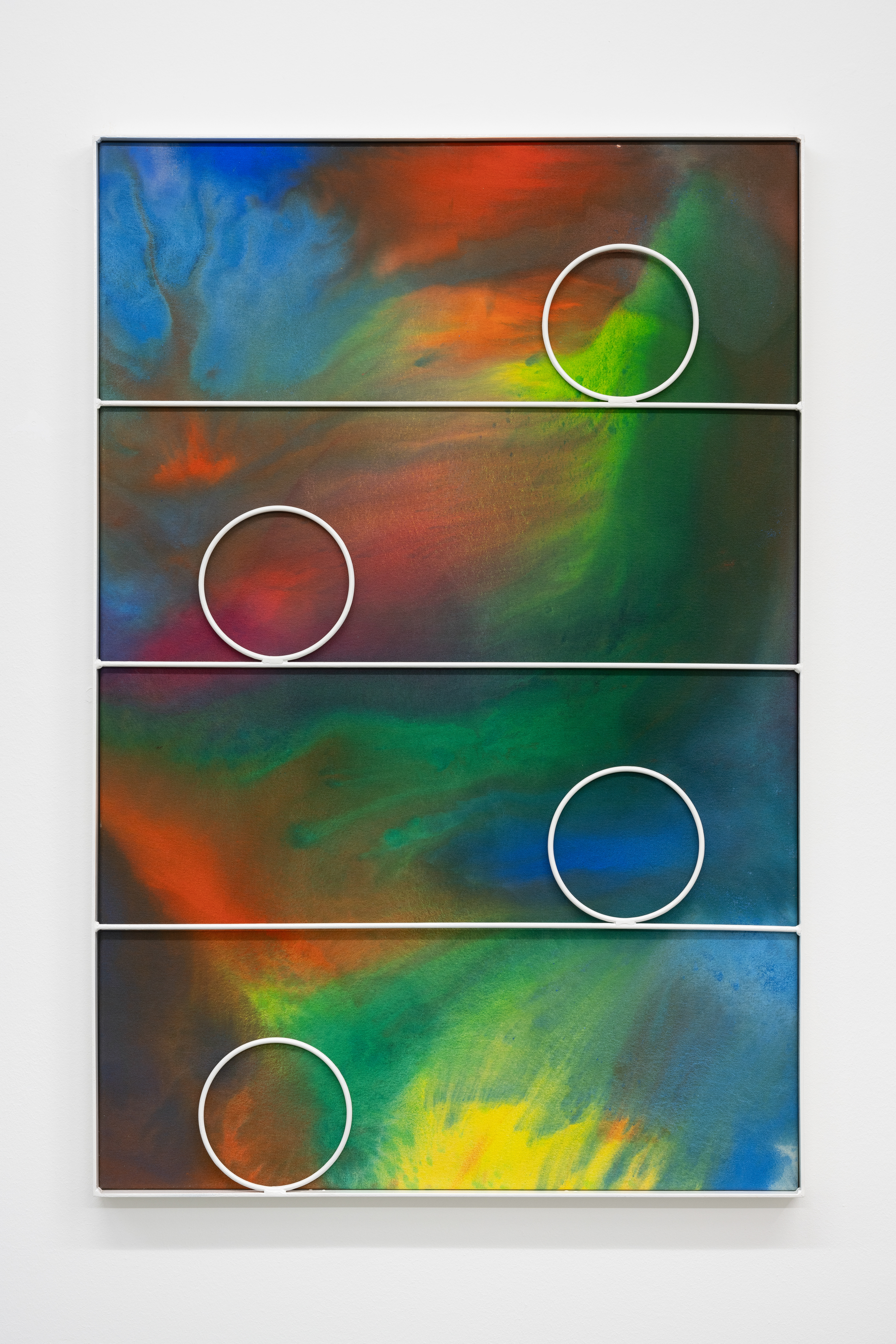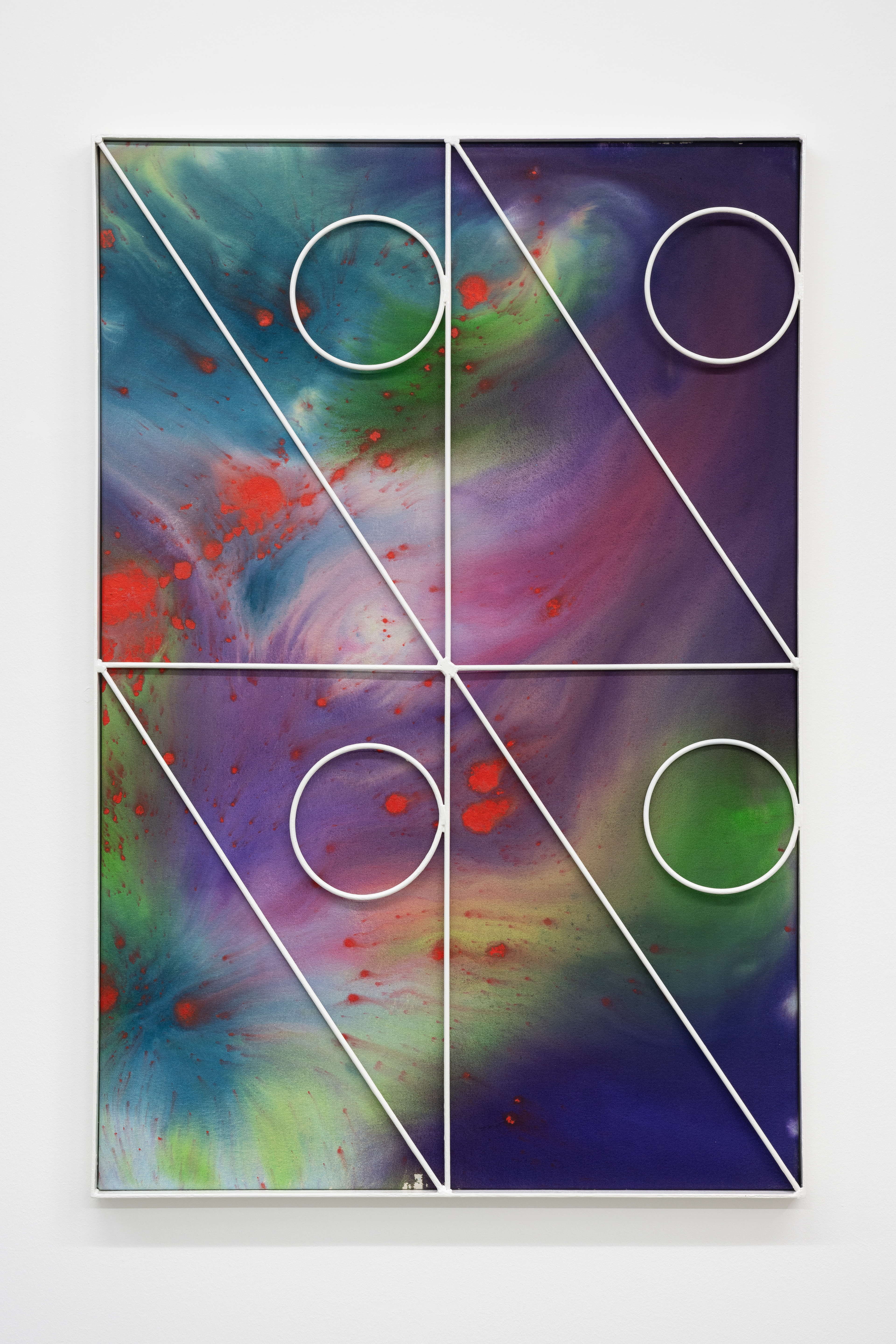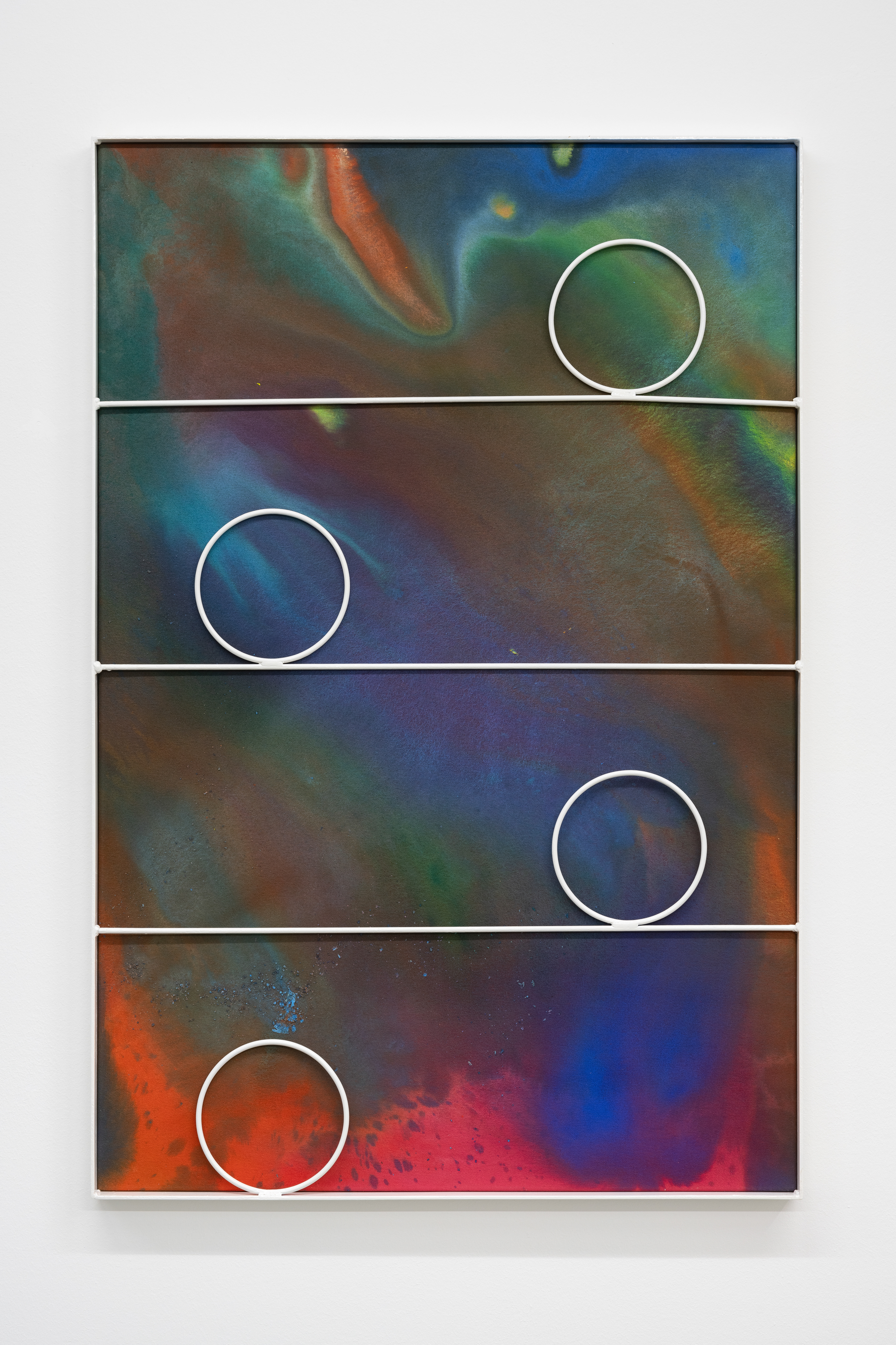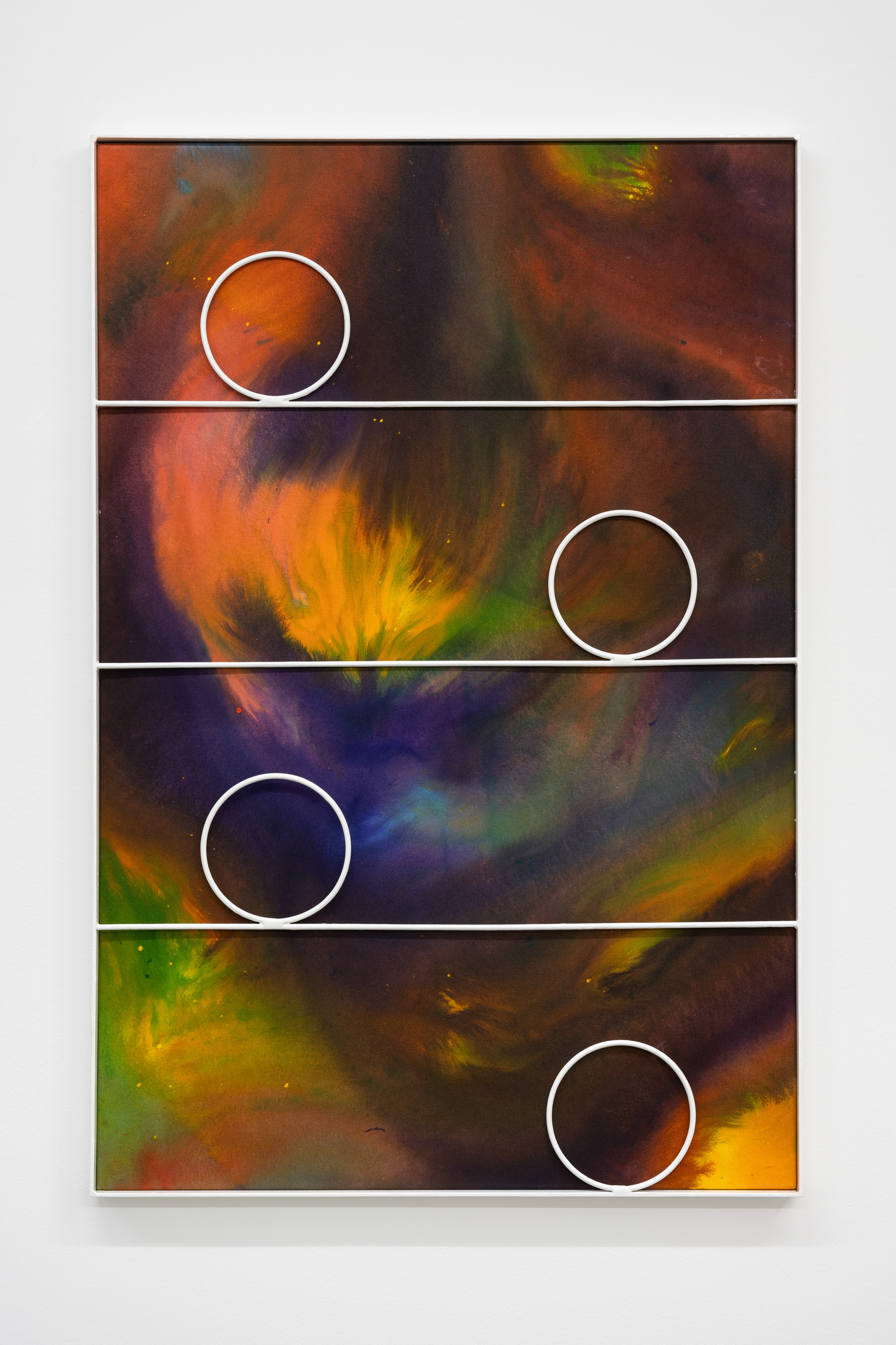 With Interior Lives, Przemek Pyszczek projects us into his personal creative dimension, into a landscape determined by elements that generate a kind of contrast, or rather a dualism between opposing forces and circumstances. The walls of the gallery lose their merely structural function and become the ideal façade of a house where the “paintings/windows” open to an idea of elsewhere. These works are membranes between two dimensions, Cartesian axes that establish a “this side” and a “beyond.” The iron structures resting on top of the canvases and a characteristic feature of Pyszczek’s work, in the new series no longer converse with geometrically defined backgrounds, rather the circular silhouettes and diagonal segments, echoing the typical gratings of Polish city centers, stand out in contrast on surfaces treated with a fluid paint that flows over the support and blends following an indeterminate stream, sometimes even leaving portions of rough fabric, discontinuities due to chance and the unpredictable water repellency of the canvas. A movement that in this case acts on a microscopic level, but has an unfathomable universal echo. The visual manifestation of this flow is reminiscent of the shapes that sea water draws when it breaks on sand, the way rivers, lakes, and continents have formed over millennia by intervening in the morphology of the earth, and the conformation of stars and galaxies that we observe when we look at deep space photography. A minimal gesture that contrasts with the artificiality of the grid by deconstructing reality and making us reflect on the nature of the creative act in relation to an immanent conception of the divine.