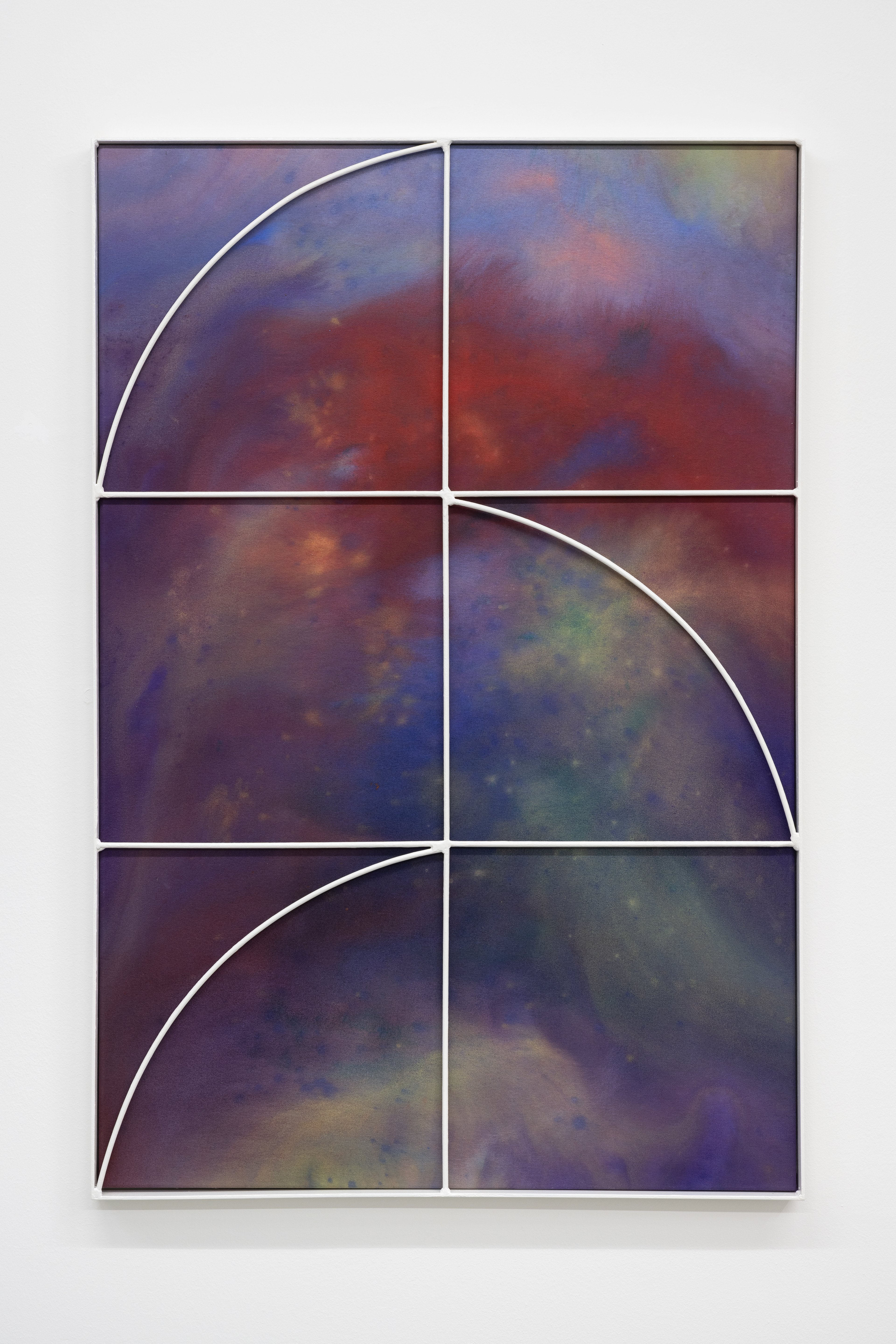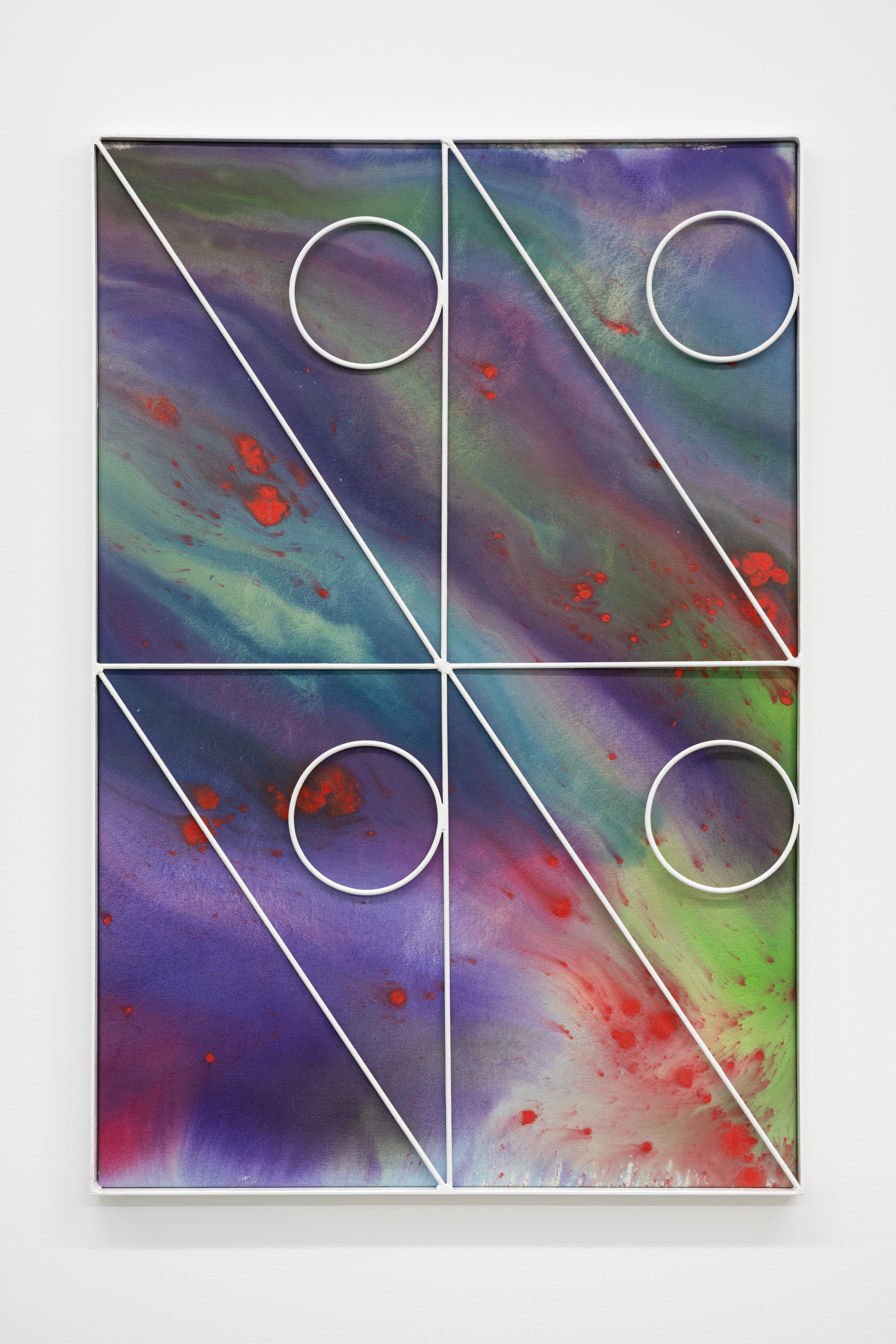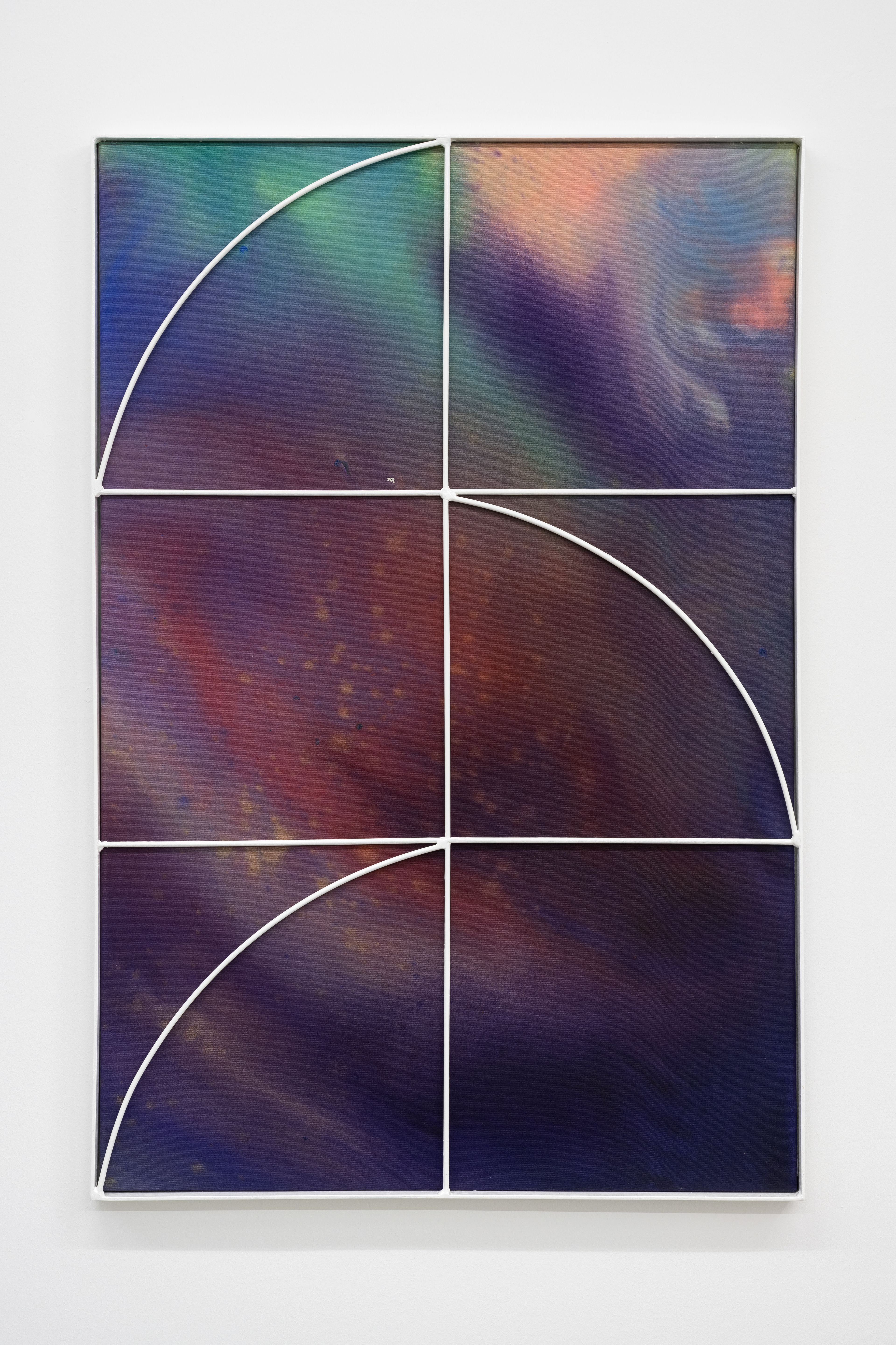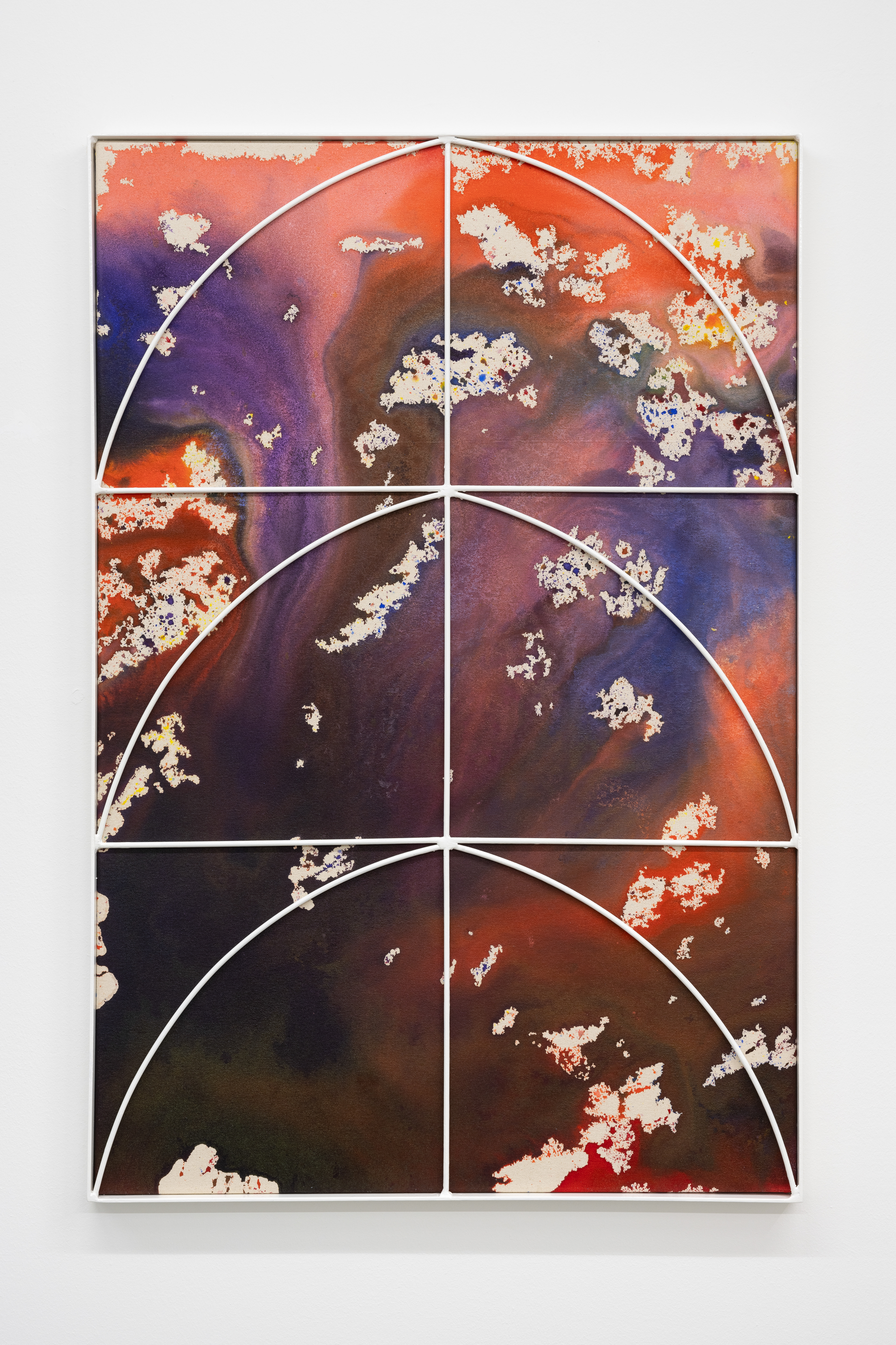 With Interior Lives, Przemek Pyszczek projects us into his personal creative dimension, into a landscape determined by elements that generate a kind of contrast, or rather a dualism between opposing forces and circumstances. The walls of the gallery lose their merely structural function and become the ideal façade of a house where the “paintings/windows” open to an idea of elsewhere. These works are membranes between two dimensions, Cartesian axes that establish a “this side” and a “beyond.” The iron structures resting on top of the canvases and a characteristic feature of Pyszczek’s work, in the new series no longer converse with geometrically defined backgrounds, rather the circular silhouettes and diagonal segments, echoing the typical gratings of Polish city centers, stand out in contrast on surfaces treated with a fluid paint that flows over the support and blends following an indeterminate stream, sometimes even leaving portions of rough fabric, discontinuities due to chance and the unpredictable water repellency of the canvas. A movement that in this case acts on a microscopic level, but has an unfathomable universal echo. The visual manifestation of this flow is reminiscent of the shapes that sea water draws when it breaks on sand, the way rivers, lakes, and continents have formed over millennia by intervening in the morphology of the earth, and the conformation of stars and galaxies that we observe when we look at deep space photography. A minimal gesture that contrasts with the artificiality of the grid by deconstructing reality and making us reflect on the nature of the creative act in relation to an immanent conception of the divine.