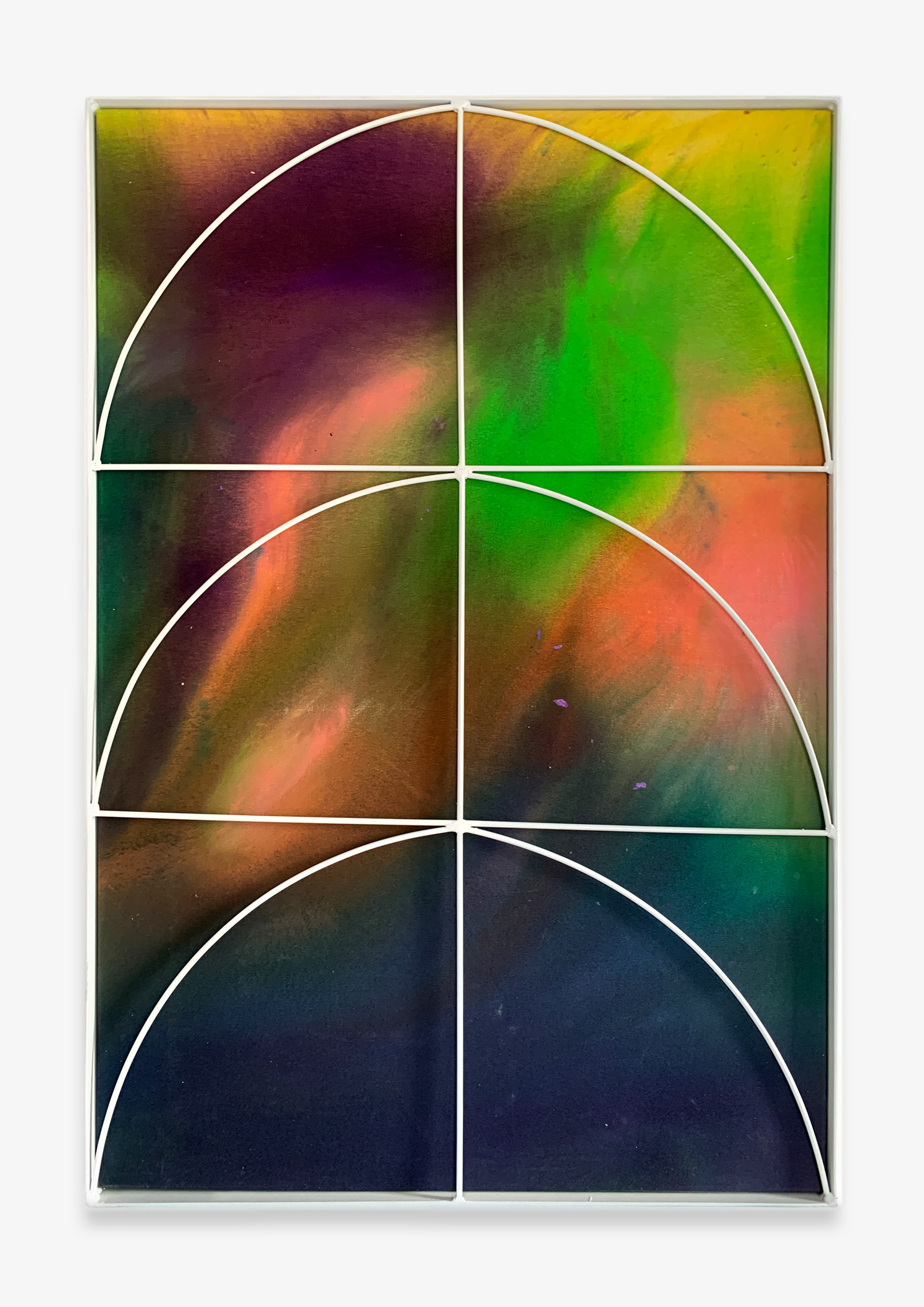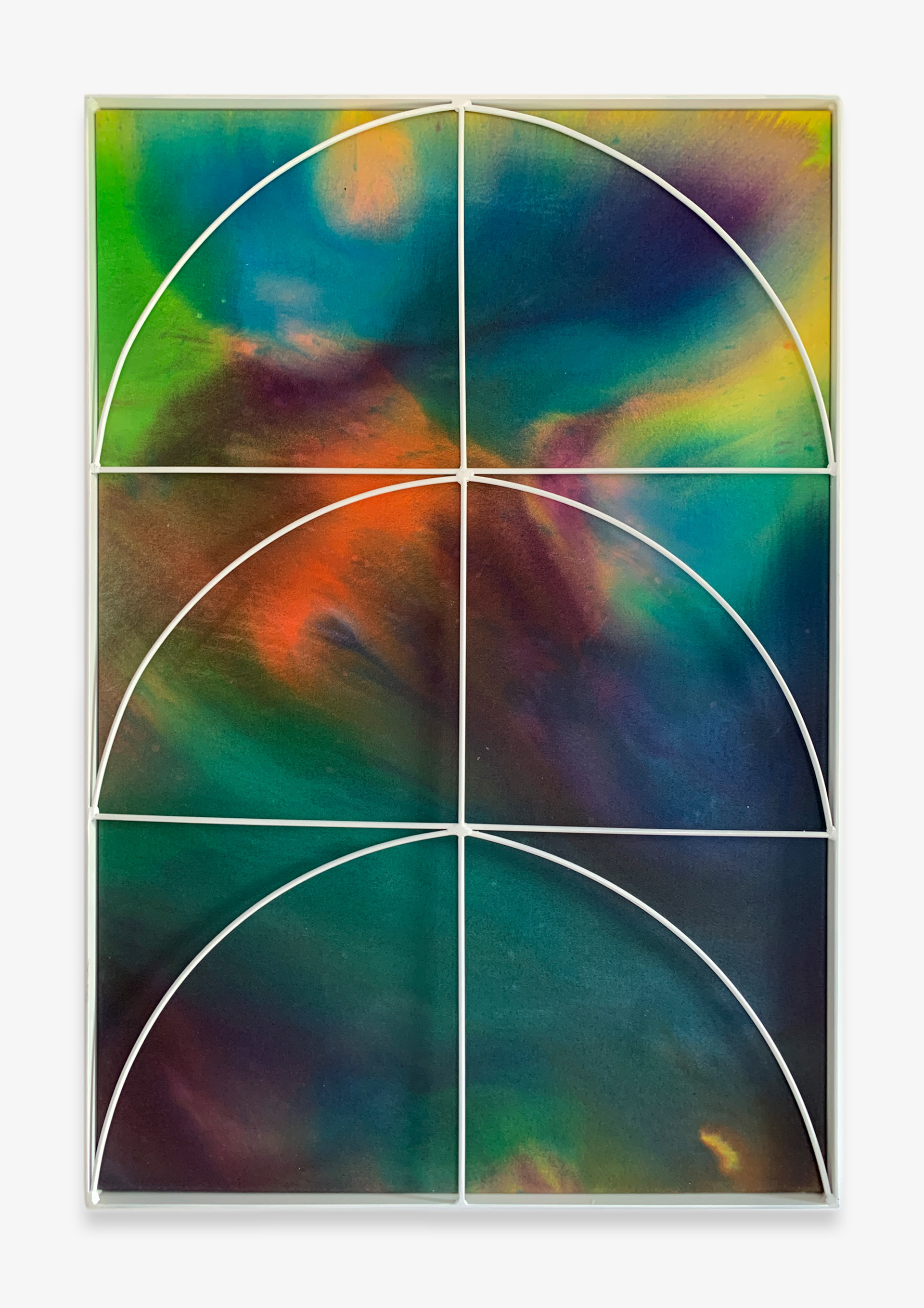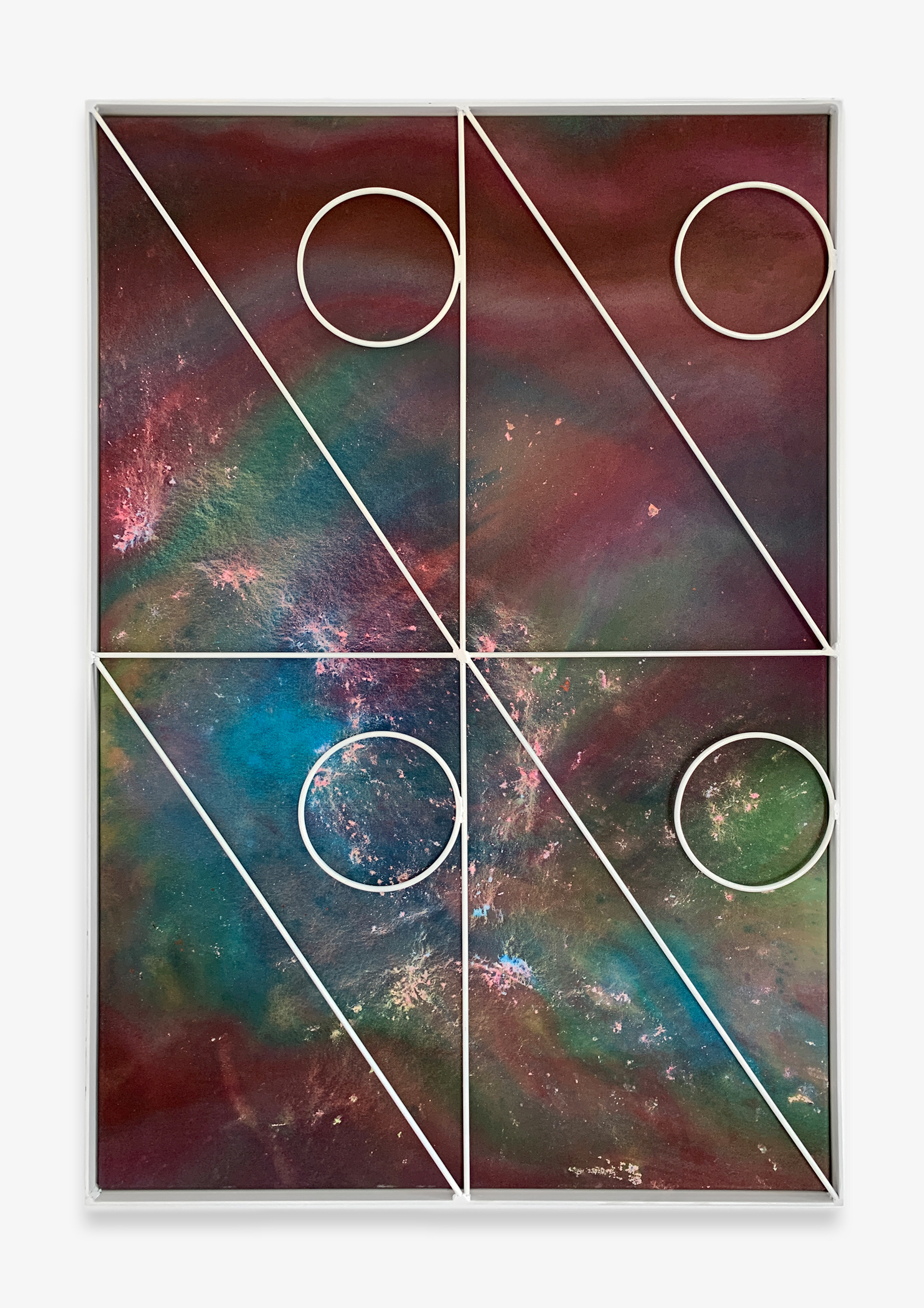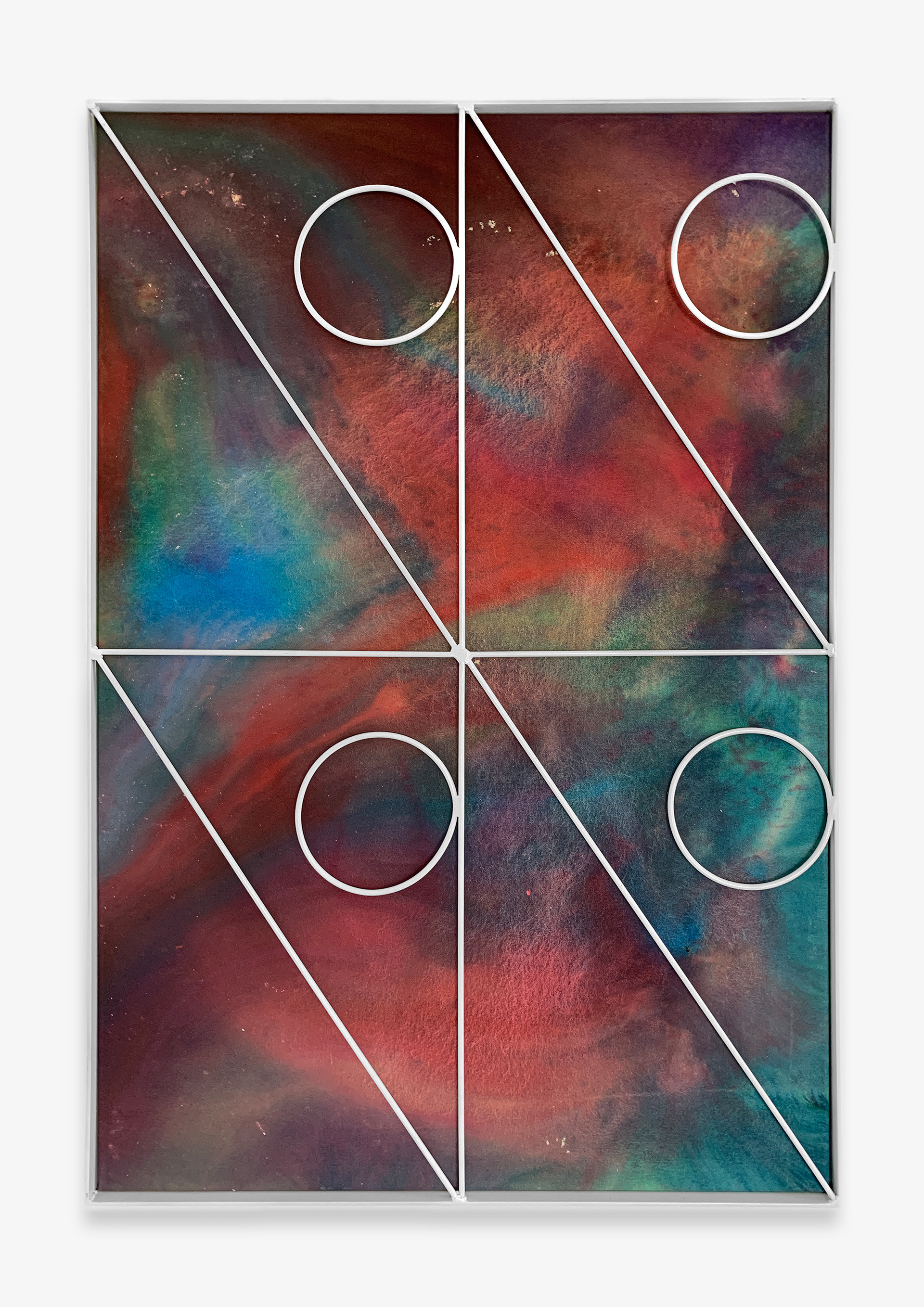 With Interior Lives, Przemek Pyszczek projects us into his personal creative dimension, into a landscape determined by elements that generate a kind of contrast, or rather a dualism between opposing forces and circumstances. The walls of the gallery lose their merely structural function and become the ideal façade of a house where the “paintings/windows” open to an idea of elsewhere. These works are membranes between two dimensions, Cartesian axes that establish a “this side” and a “beyond.” The iron structures resting on top of the canvases and a characteristic feature of Pyszczek’s work, in the new series no longer converse with geometrically defined backgrounds, rather the circular silhouettes and diagonal segments, echoing the typical gratings of Polish city centers, stand out in contrast on surfaces treated with a fluid paint that flows over the support and blends following an indeterminate stream, sometimes even leaving portions of rough fabric, discontinuities due to chance and the unpredictable water repellency of the canvas. A movement that in this case acts on a microscopic level, but has an unfathomable universal echo. The visual manifestation of this flow is reminiscent of the shapes that sea water draws when it breaks on sand, the way rivers, lakes, and continents have formed over millennia by intervening in the morphology of the earth, and the conformation of stars and galaxies that we observe when we look at deep space photography. A minimal gesture that contrasts with the artificiality of the grid by deconstructing reality and making us reflect on the nature of the creative act in relation to an immanent conception of the divine.