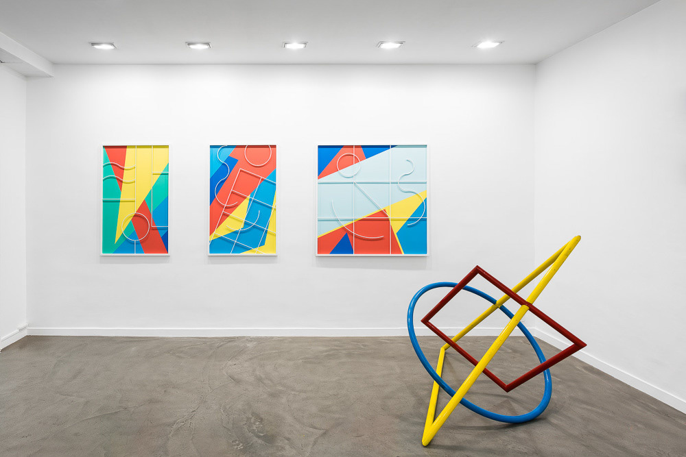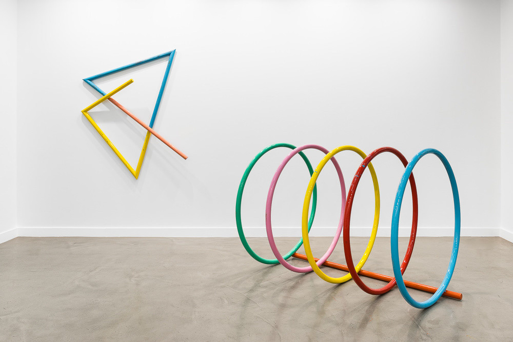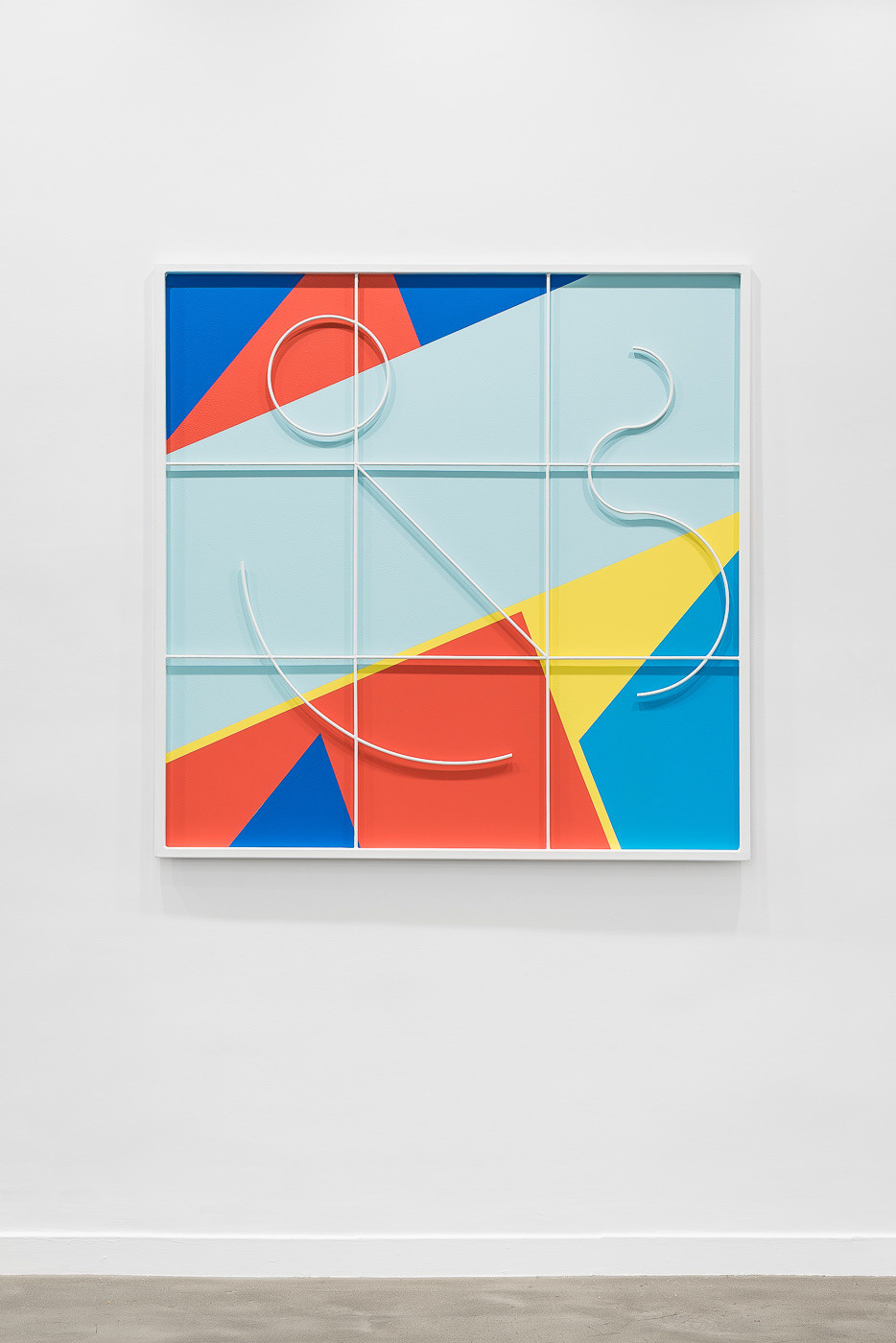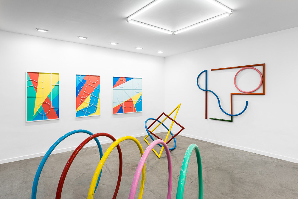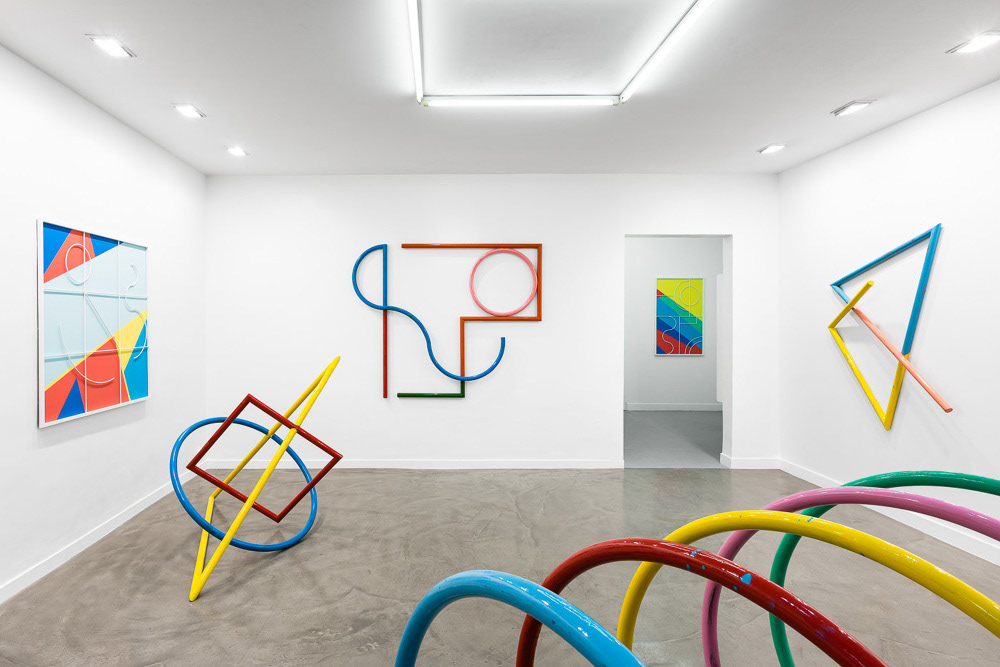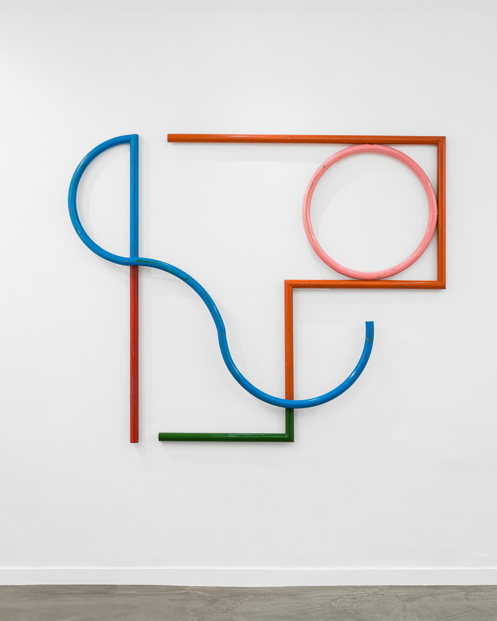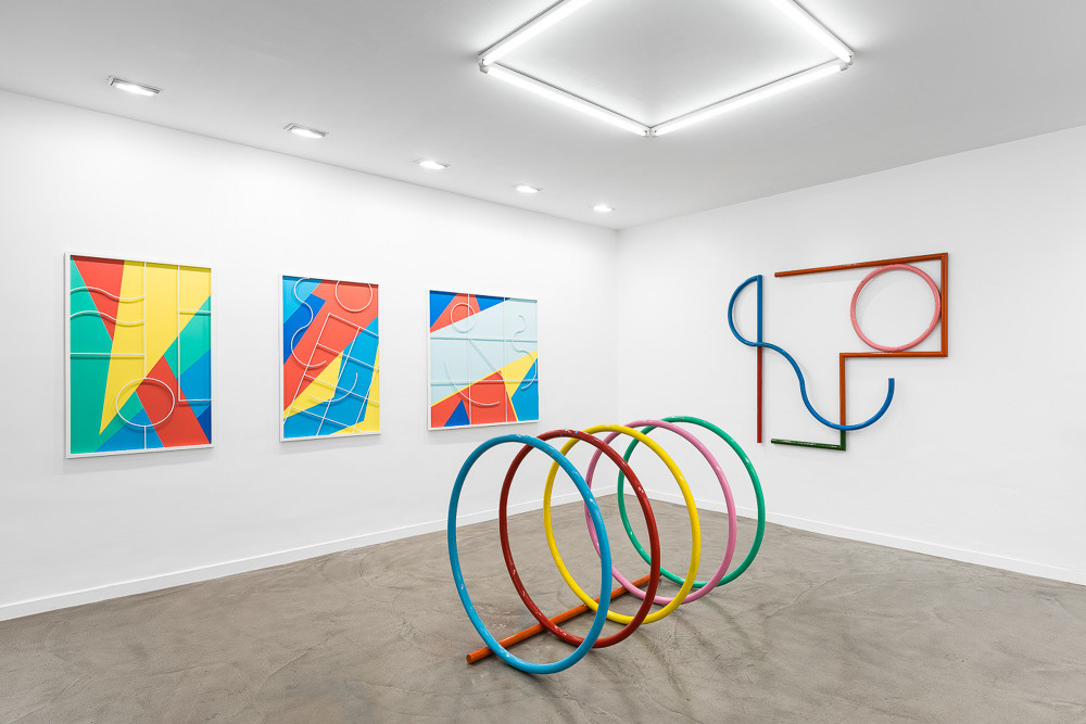 For his first solo exhibition in France, Przemek Pyszczek has produced a corpus of work that addresses his aesthetic and architectural research. Indeed, his bas-relief paintings reuse the same geometry of circles, squares or waves that decorate the balconies of Polish modernist buildings, and his sculptures manufactured by Polish metal factories are evocative of those colourful communist playgrounds. And yet, the artist seems to incorporate a certain distance vis-à-vis the architectural form, a distance that is made possible by the decontextualization he performs, from the street to the exhibition space. In their geometry, and in their use of bright, primary colours, his works also recall the constructivist compositions of the Polish sculptor Katarzyna Kobro who, in the interwar period and up until her death in 1951, produced a corpus of works of visionary architectural quality that instil harmony between the urban space and the observer’s experience, while at the same time advocating the idea that a work of art should not have a uniquely theoretical or aesthetic function, but also convey social criticism.